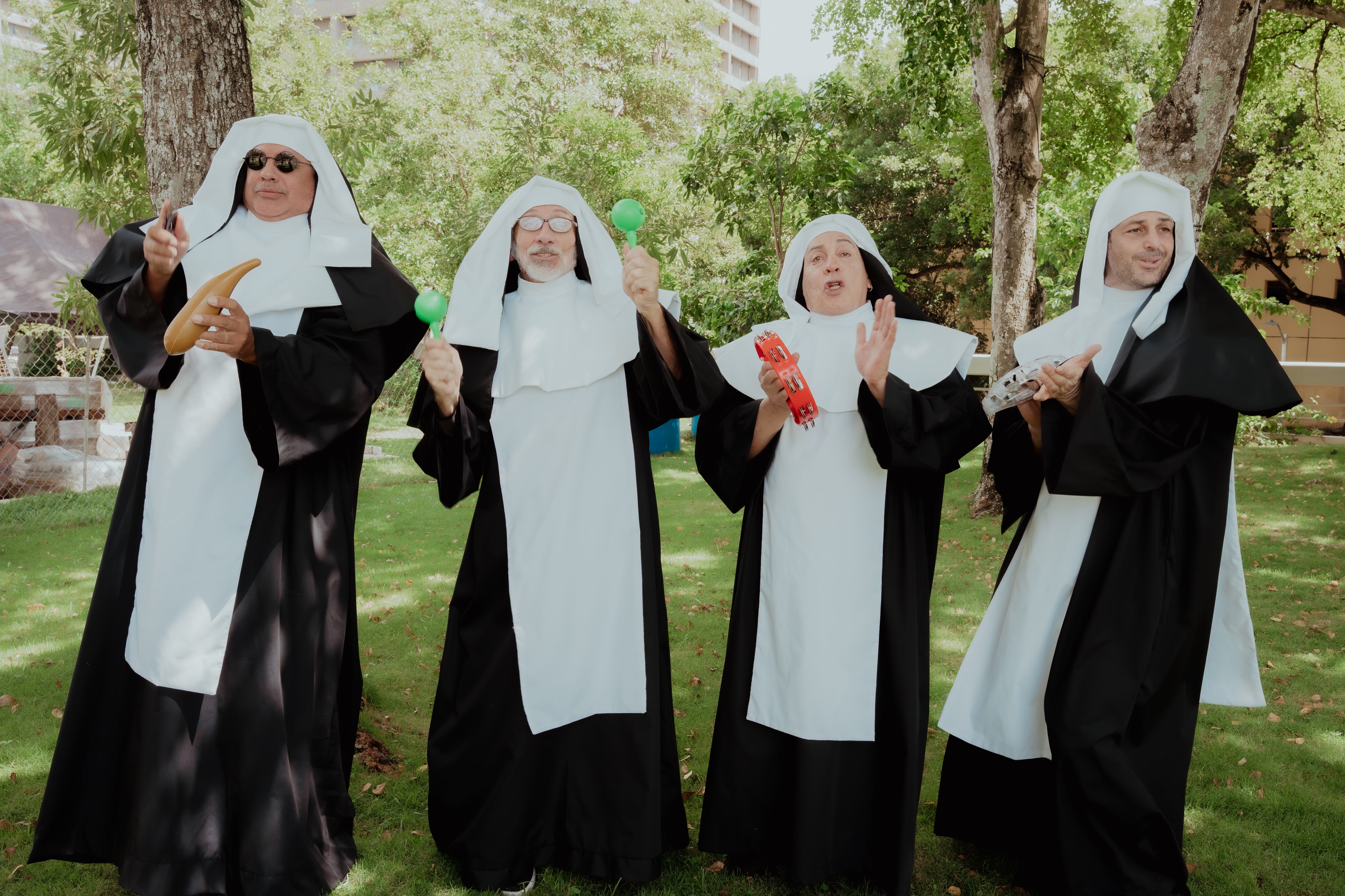 La historia de la comedia se desarrolla en el convento de las Hermanas del Pie Diestro en Briston, donde cuatro monjas —una ciega, otra sorda, una vasca y la astuta Madre Abadesa— se verán envueltas en un misterioso escándalo a medianoche.