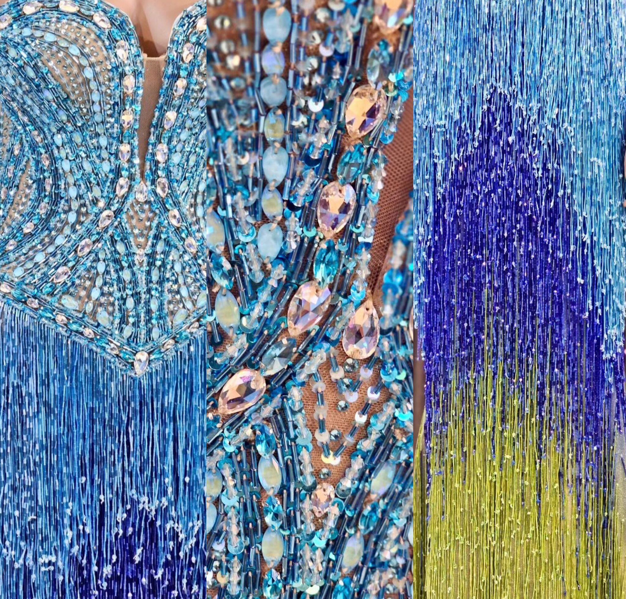 “Está inspirado en la majestuosidad de El Yunque, la selva tropical de Puerto Rico. Con un escote de amor que mejora la figura y un gradiente de color que cambia de azul cielo a verde vibrante, evoca el cielo, vegetación exuberante y abundante flora del bosque. Los flecos añaden un toque de brillo y movimiento, imitando gotas de agua y las cascadas, permitiendo que cada paso que Jennifer Colón da, capture la magia de la selva. Este vestido celebra la riqueza natural de Puerto Rico y encarna el espíritu caribeño: elegante, exuberante y lleno de vida”.