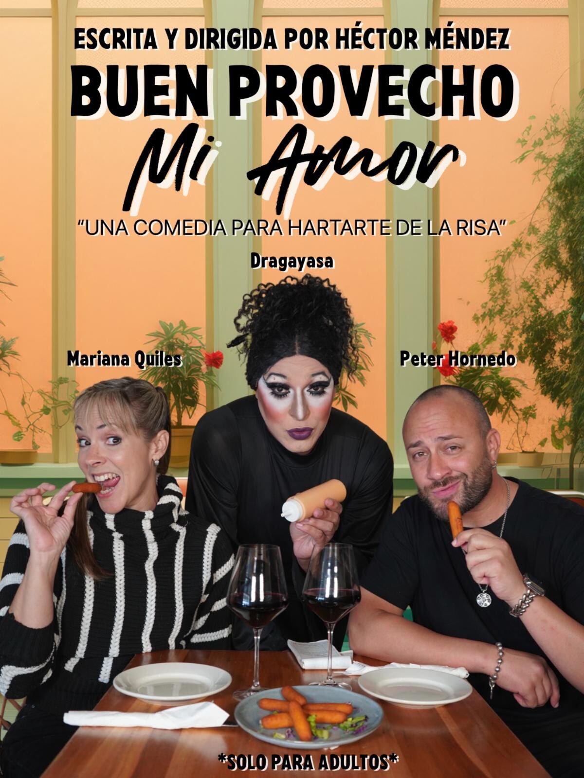 Del reconocido dramaturgo puertorriqueño Héctor Méndez, autor de éxitos como “No hay más huevo pa’ti”, “Pásamelo Doble” y “Ay Bendito que Puerto Rico”, llega la nueva comedia “Buen Provecho, Mi Amor”. Esta divertidísima obra explora el amor, la diferencia de edades y los prejuicios en las relaciones de pareja, todo a raíz del absurdo “qué dirán”.