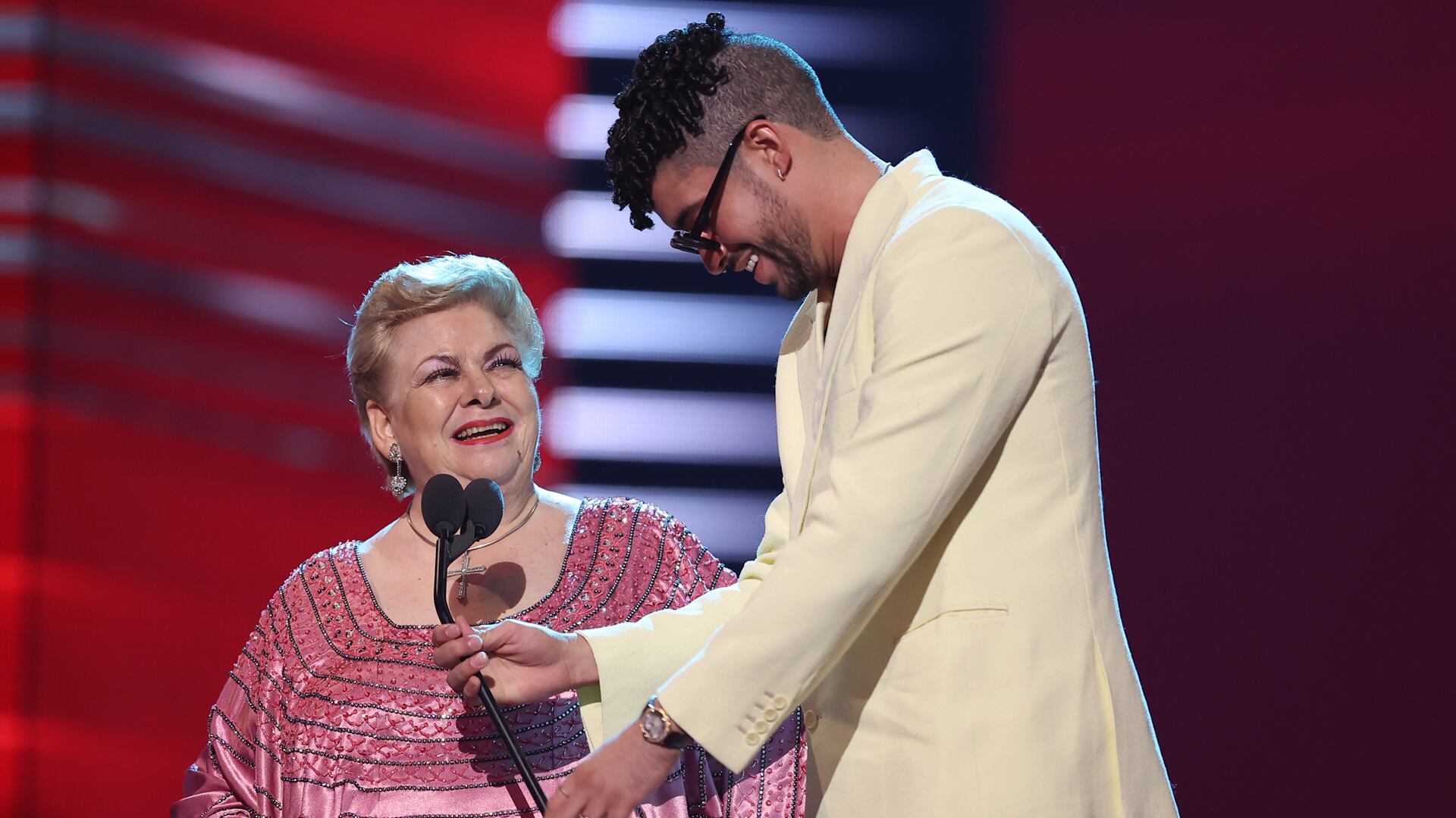 Bad Bunny sostuvo el micrófono con su mano a una altura cómoda, para que Paquita la del Barrio pudiera dar su discurso con tranquilidad.
