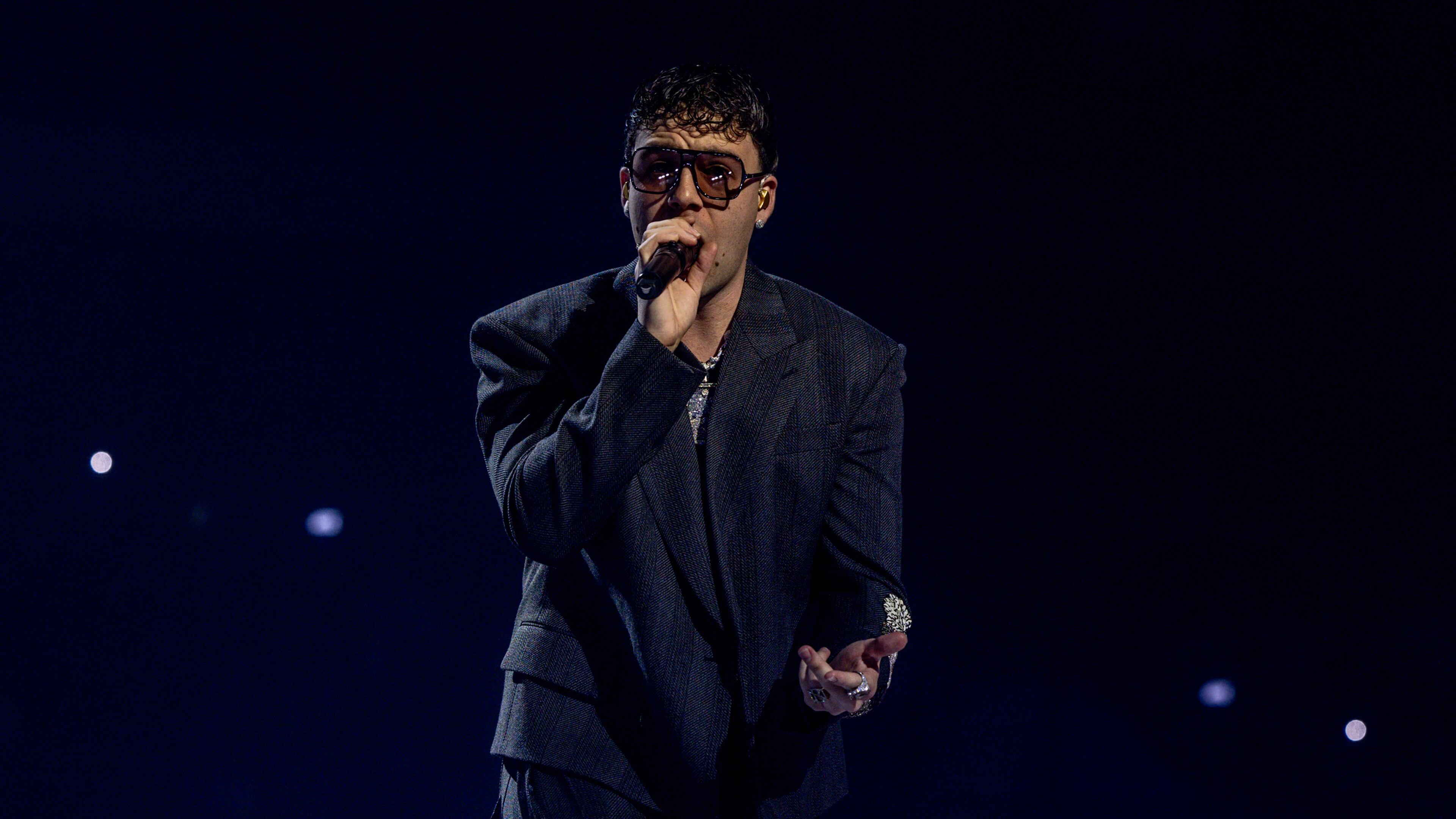 El autor de ‘Playa del Inglés’ salió al escenario enfundado en un traje negro, gafas de aviador y su característica cadena de diamantes que simula el cuadro de ‘La noche estrellada’ de Vincent Van Gogh, ante un recinto abarrotado que ha coreado su nombre mientras sonaba la primera canción de su álbum, ‘Kassandra’.