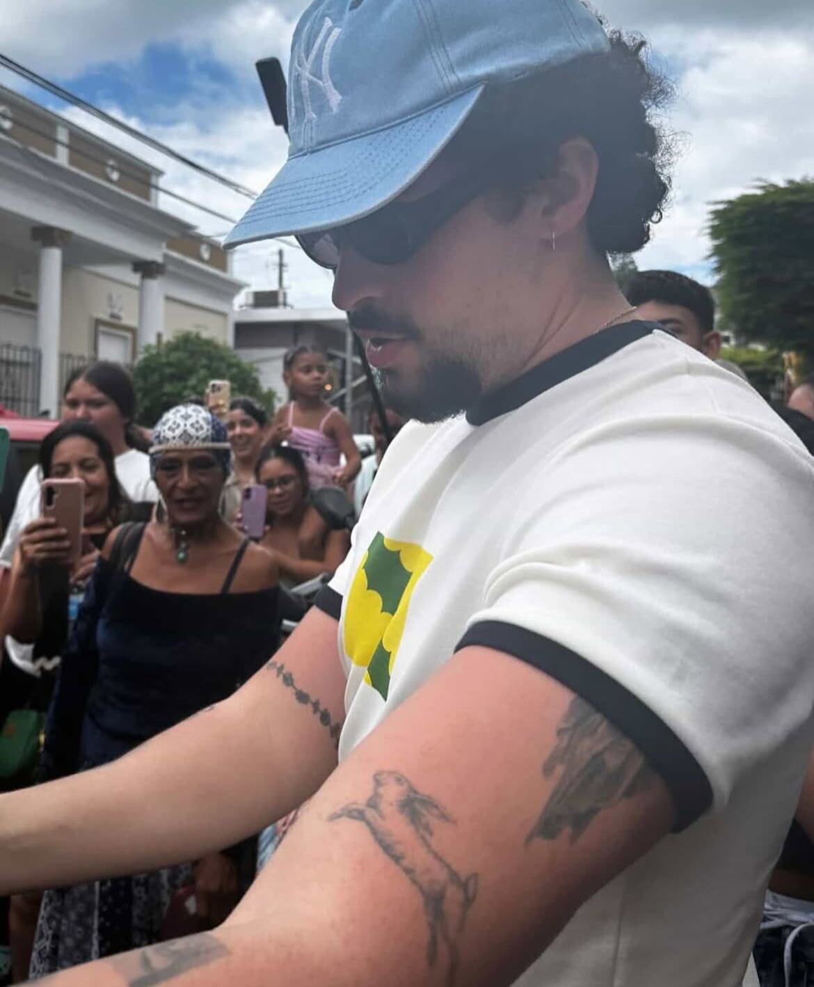 En compañía de un par de señores, Bad Bunny fue parte de un juego amistoso de dominó, mientras un grupo de fanáticos lo observaban mover cada jugada.