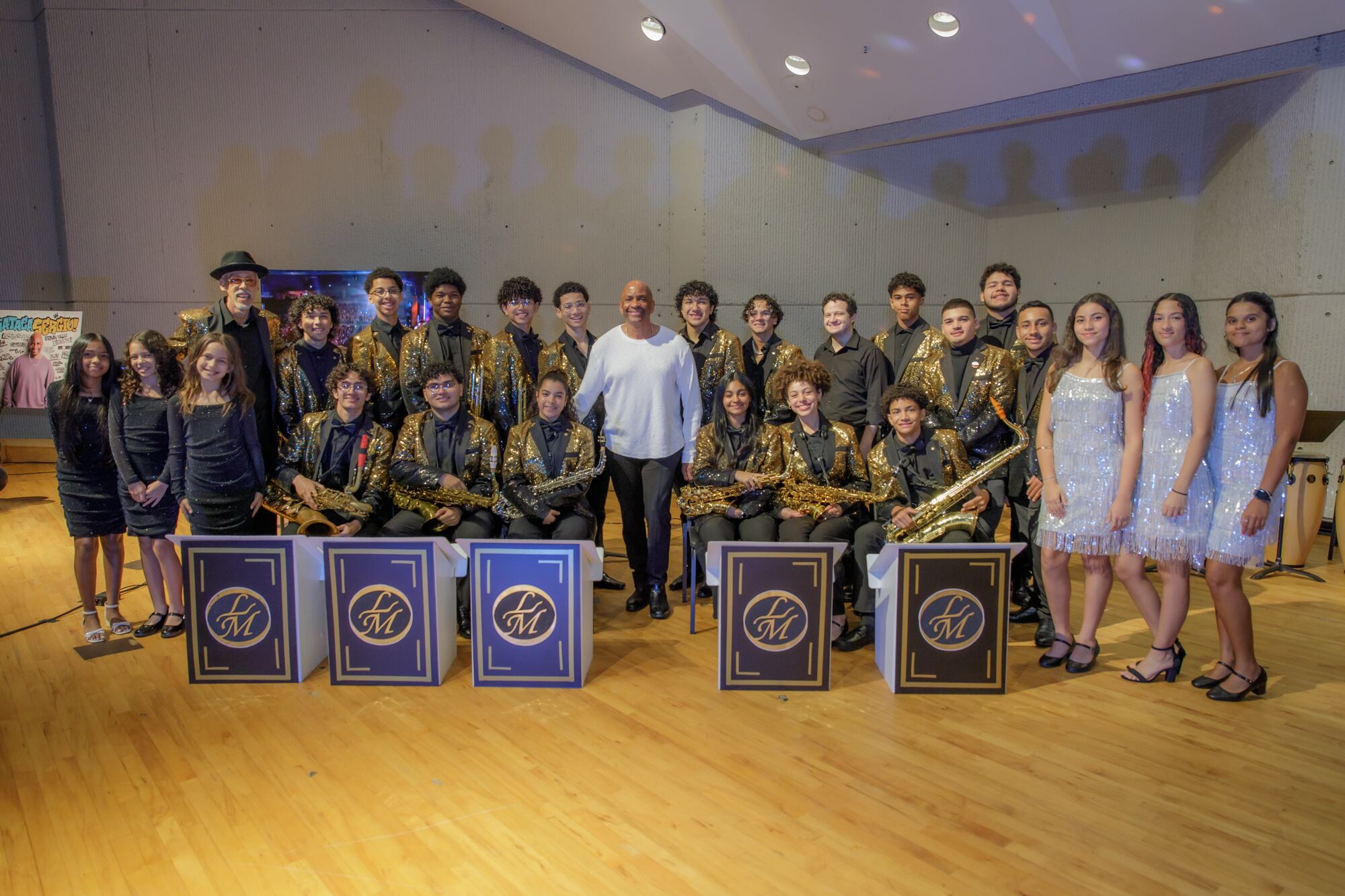 El galardonado productor y arreglista Sergio George recibió en el día de hoy, jueves, un homenaje de parte de los talentosos estudiantes de la banda de la Escuela La Libre de Música Ernesto Ramos Antonini en San Juan.
