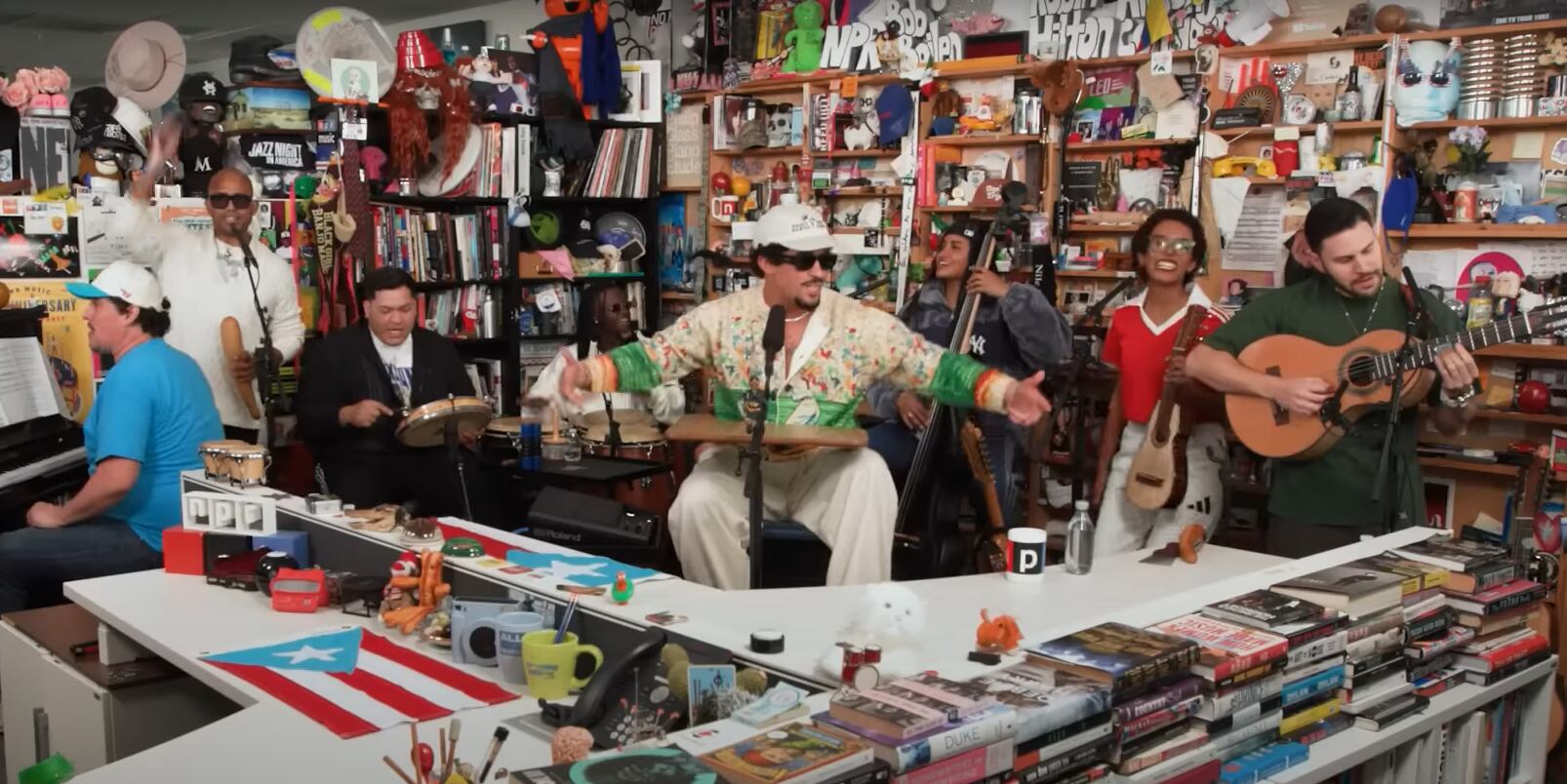 Puerto Rico ha estado representado por decenas de artistas en el escritorio íntimo de NPR. Recientemente,Bad Bunny protagonizó un inolvidable Tiny Desk Concert. Grabado en febrero de 2025 en Washington D.C., presentó canciones de su álbumDebí Tirar Más Fotos, remarcando géneros como plena, bomba y salsa, en un show cargado de simbolismo boricua: interpretó temas comoPIToRRO DE COCO,VOY A LLeVARTE PA PR,LO QUE LE PASÓ A HAWAii y cerró con LA MuDANZA acompañado de la banda puertorriqueña Los Sobrinos, y estandartes boricuas confeccionadas por Milagros Rosado.