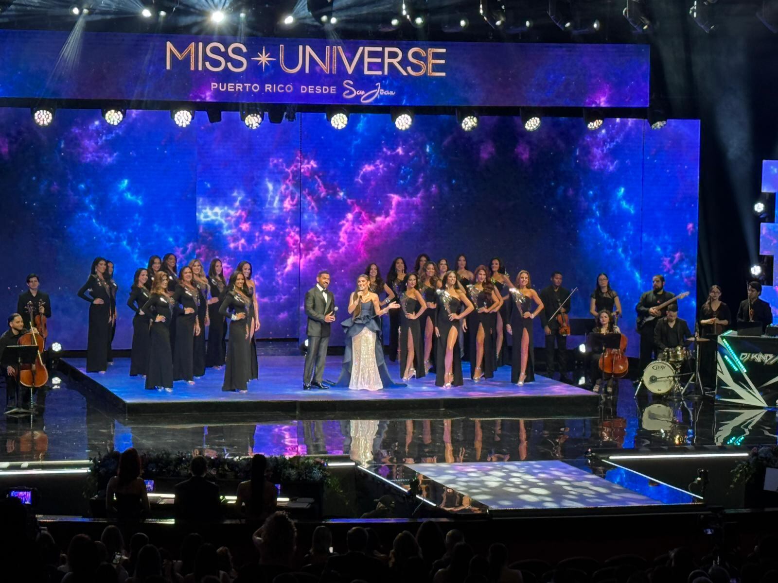 La noche final de Miss Universe Puerto Rico 2025 inició con un opening en el Centro de Bellas Artes de San Juan, donde las 23 candidatas se presentaron ante el público y lucieron vestidos largos en color negro con detalles plata.