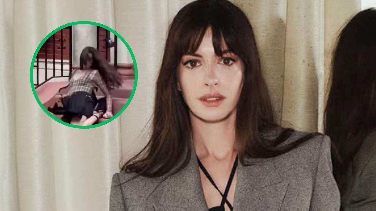 Vestida con una falda negra, una blusa transparente de cuadros y tacones altos, Hathaway perdió el equilibrio, pero lejos de mostrar incomodidad, rápidamente se levantó con una sonrisa y exclamó “Estoy bien” ante el equipo de producción y los fanáticos presentes, quienes aplaudieron su reacción.