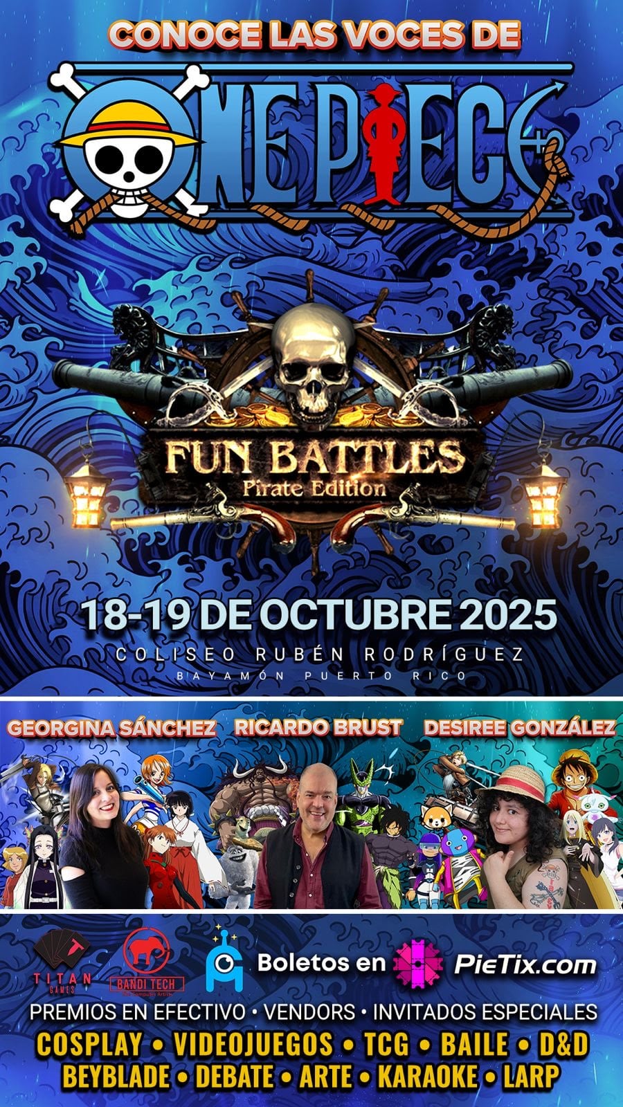 Un evento para toda la familia: habrá juegos, retos físicos y mentales donde el público puede participar para ganar premios y demostrar sus habilidades o talentos en cada una de las categorías. Además, contarán con artistas invitados que le dan la voz a personajes de la serie de anime One Piece en español.