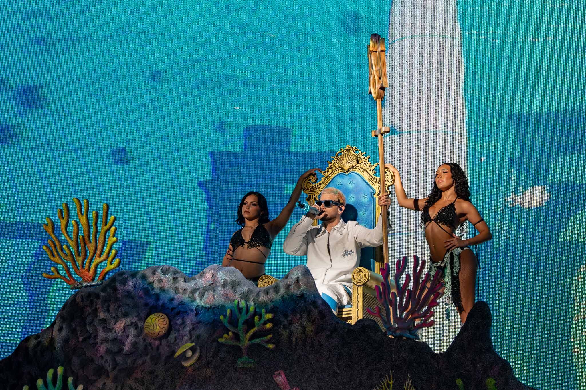Para esta ocasión, el Choliseo contó con doble tarima, escenografía, luces y efectos visuales que simulaban estar debajo del mar, acompañado por una banda en vivo, el cantante dio inicio a su presentación sentado en un trono, llevando al público por distintas etapas de su historia artística, desde sus inicios en el residencial Llorens Torres hasta el concepto que hoy da forma a Underwater.