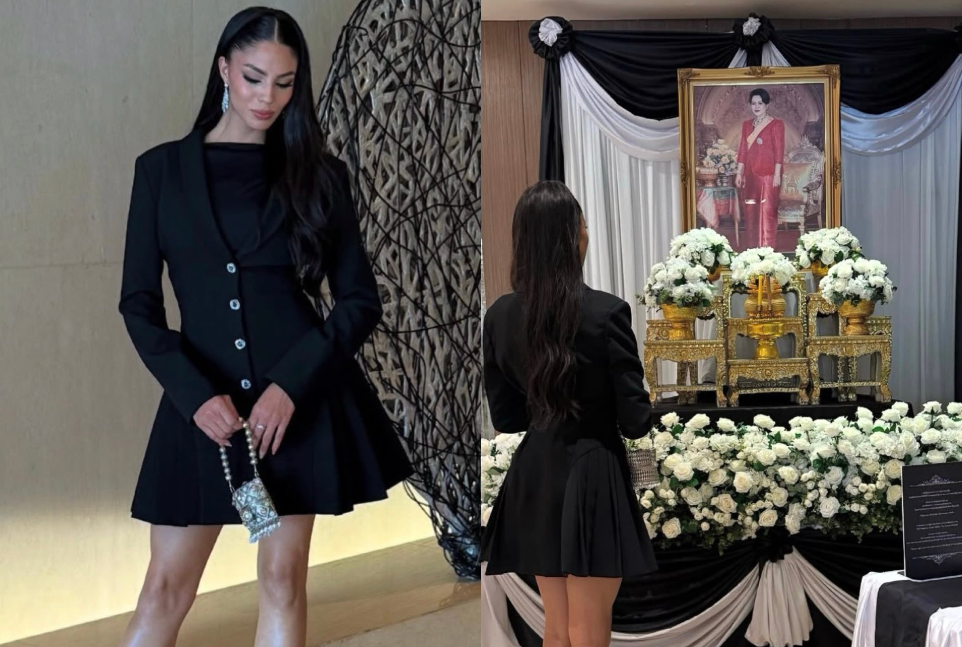 La beldad boricua, de 26 años, lució un elegante conjunto negro a su llegada al suelo tailandés y mostró respeto en un altar a la reina madre Sirikit Kitiyakara, quien falleció el pasado 24 de octubre.