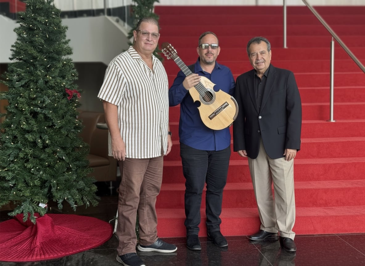 Jovino González, el cuatrista Christian Nieves y el maestro Roselín Pabón; director emérito de la OSPR.