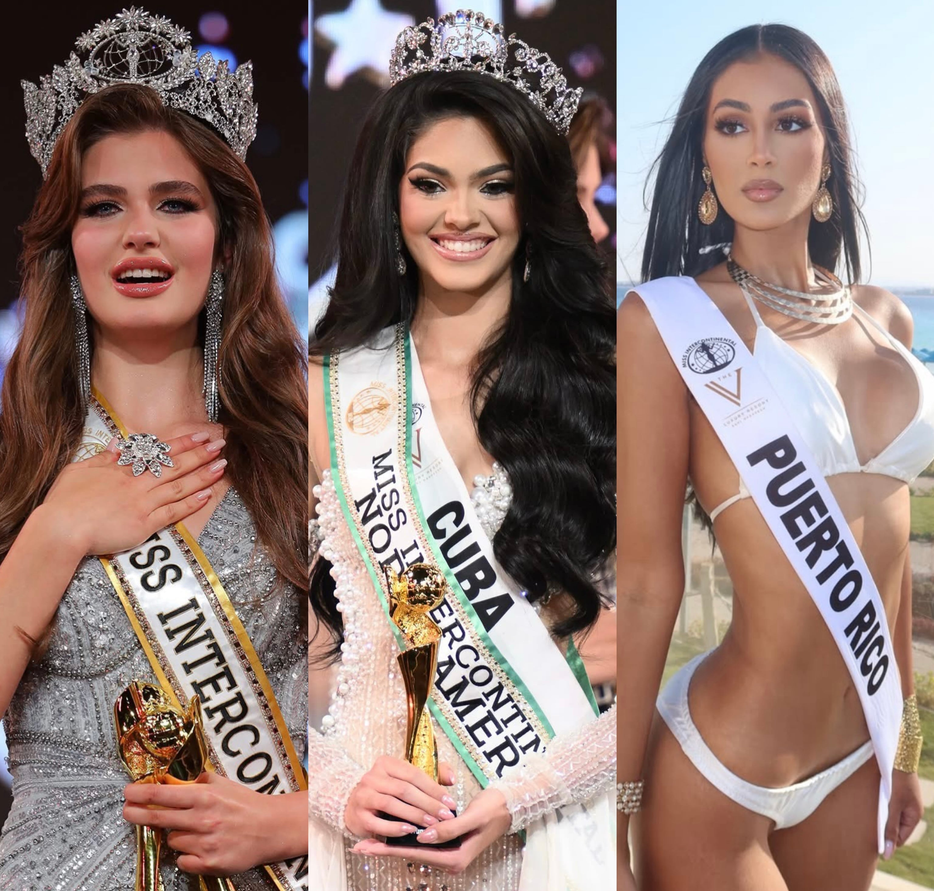 Beldades de Rusia, Cuba y Puerto Rico en Miss Intercontinental 2025-2026. Varvara Yakovenko, Lorena Suárez y Gabriela Avilés Figueroa. (Redes sociales.)