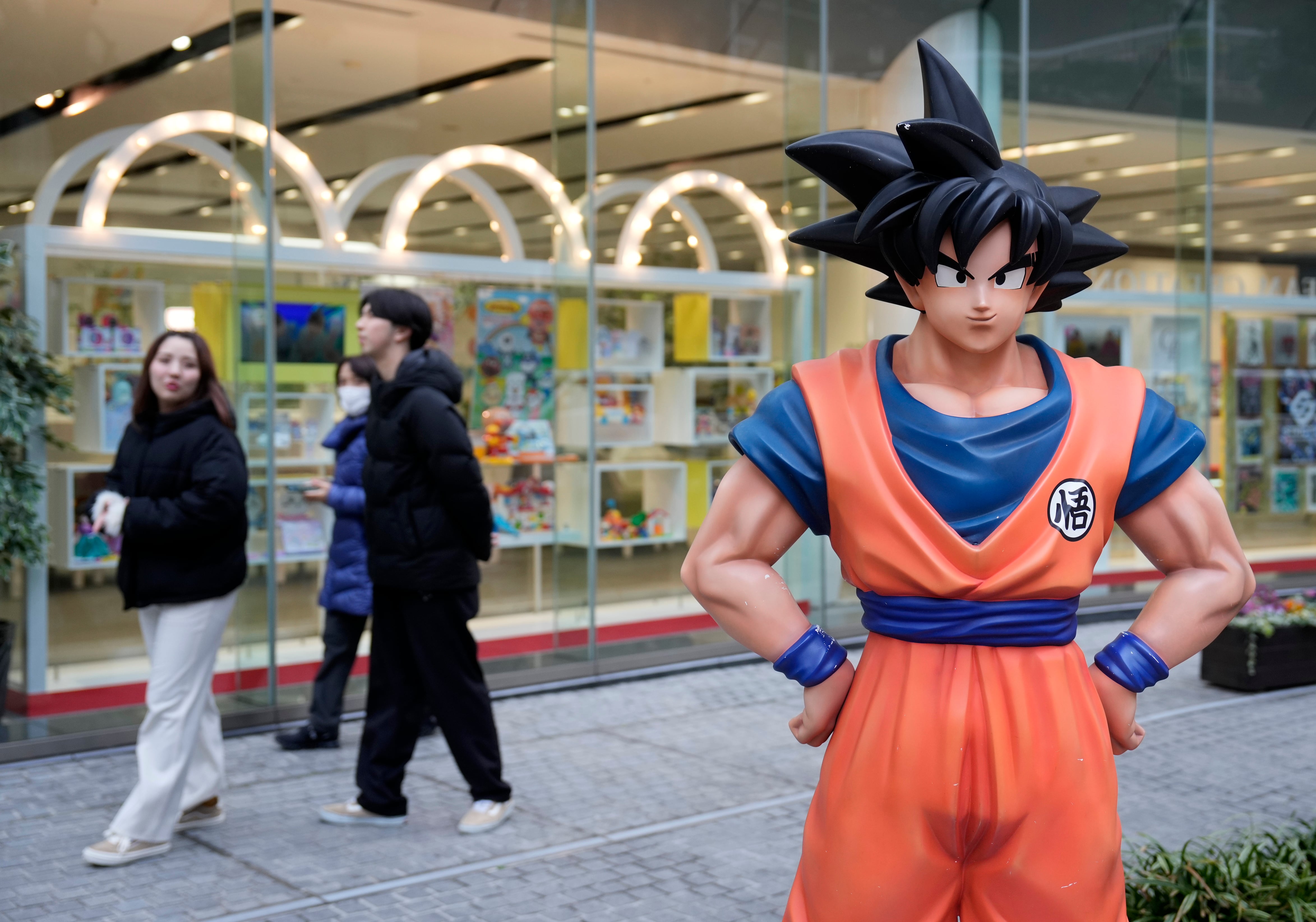 Imagen de archivo donde varios viandantes pasan junto a una escultura de Son Goku, personaje de Dragon Ball, del dibujante de manga nipón Akira Toriyama, en Tokio (Japón) el 8 de marzo de 2024. EFE/ Franck Robichon