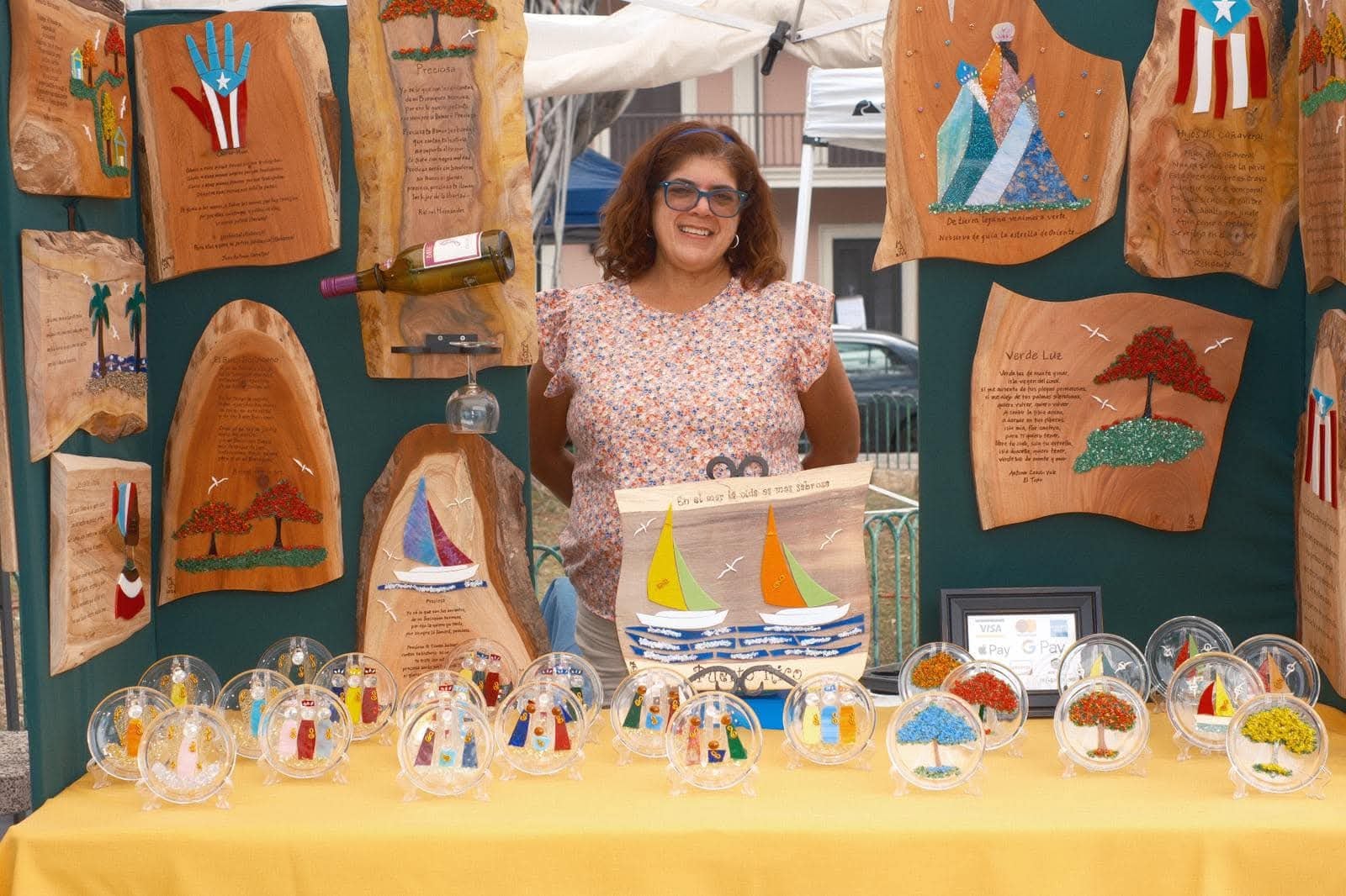 “Trabajamos sobre madera rústica, tales como caoba, almendro y majó. En las maderas, escribimos en pirograbado, canciones y poemas de nuestros compositores. Lo que ves en nuestra mesa es pura cultura puertorriqueña”, reveló la cagueña.
