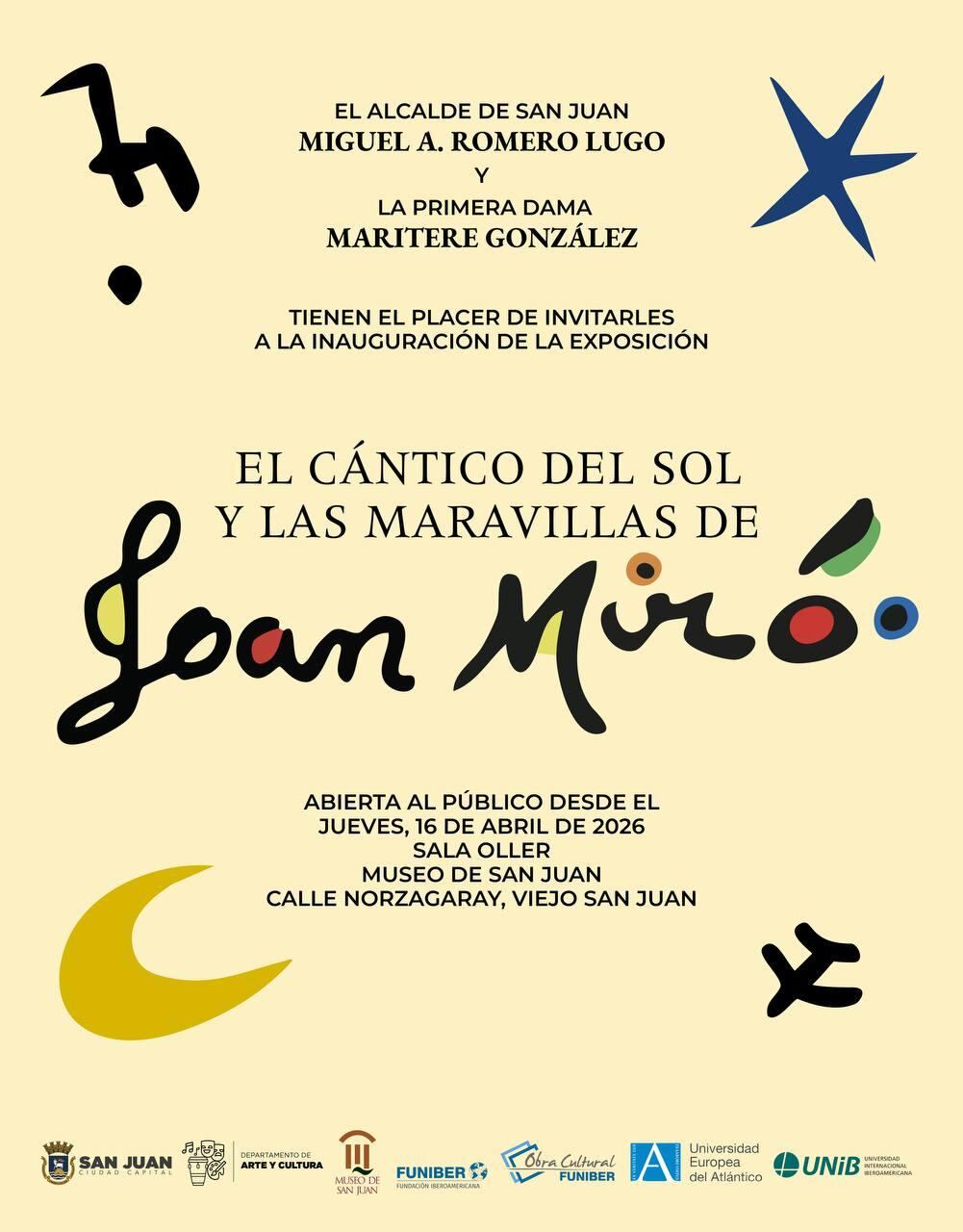 El alcalde de San Juan, Miguel A. Romero Lugo, anunció la apertura de la exhibición El cántico del sol y las maravillas de Joan Miró en la Sala Oller del Museo de San Juan, como parte de los esfuerzos del Municipio para continuar ampliando el acceso a experiencias culturales de alto valor artístico. La muestra, que abre al público este jueves, 16 de abril, presenta una selección de piezas de uno de los artistas más influyentes del siglo XX. Con esta iniciativa, San Juan reafirma su compromiso con el desarrollo cultural y el acceso al arte para residentes y visitantes.