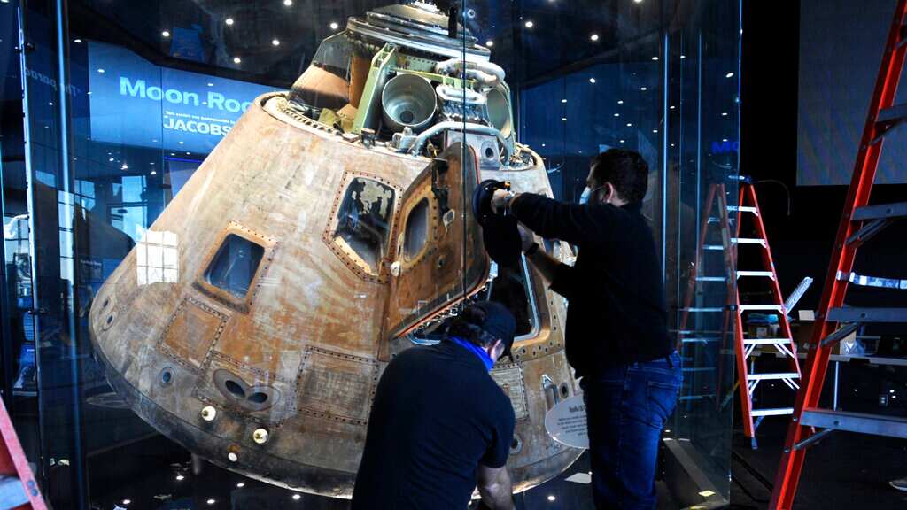 Con delicadeza, los trabajadores emplearon trapos de microfibra, barras telescópicas, pinceles, plumeros atrapapolvo y aspiradoras para limpiar recientemente la cápsula de 6,5 toneladas y tres metros (casi 11 pies) y su vitrina, situada junto a un enorme cohete Saturn V que cuelga del techo. Retiraron decenas de objetos que la gente había colado por los huecos de la vitrina.