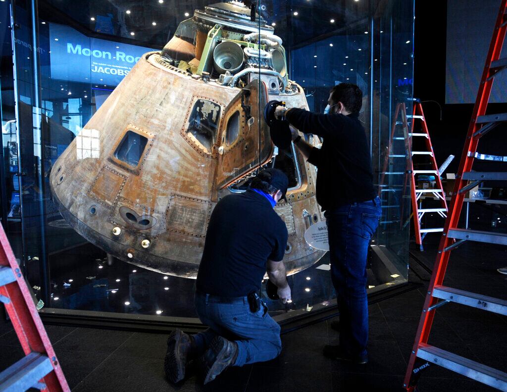 Con delicadeza, los trabajadores emplearon trapos de microfibra, barras telescópicas, pinceles, plumeros atrapapolvo y aspiradoras para limpiar recientemente la cápsula de 6,5 toneladas y tres metros (casi 11 pies) y su vitrina, situada junto a un enorme cohete Saturn V que cuelga del techo. Retiraron decenas de objetos que la gente había colado por los huecos de la vitrina.