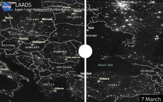 Las imágenes satelitales de la NASA enseñan el gran apagón que sufre Ucrania luego que Rusia la invadiera el pasado 24 de febrero.