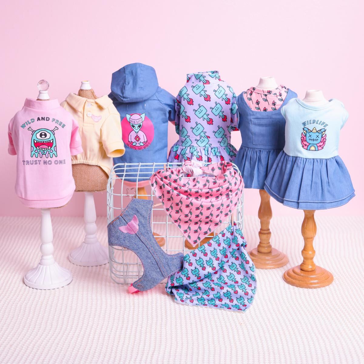 La colección comprende ropa, bandanas y arnés, elaborados en tonos pasteles, algunos con estampados de figuras extraterrestres. La icónica polo clásica regresa para la primavera en un color pastel con la intención de dejar boquiabiertos a sus guardianes cuando la vistan en combinación con el mahón.