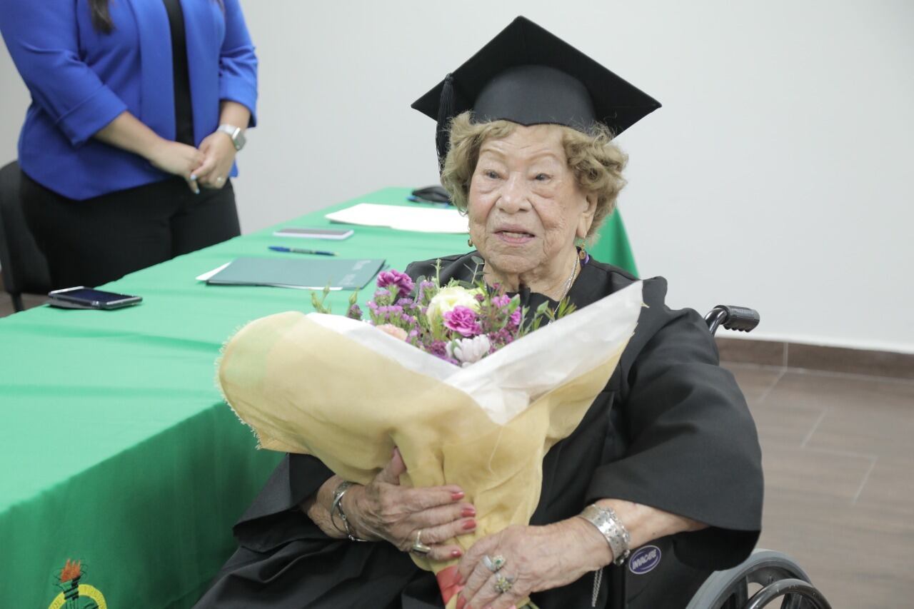 A sus 100 años de edad, la maestra Julia Teresa Zamarrón Segovia inició el trámite de su título de Licenciada en Ciencias Jurídicas por la Universidad Autónoma de Nuevo León y recibió este importante documento de manos del Rector Santos Guzmán López el 16 de mayo en el Departamento de Escolar y Archivo.