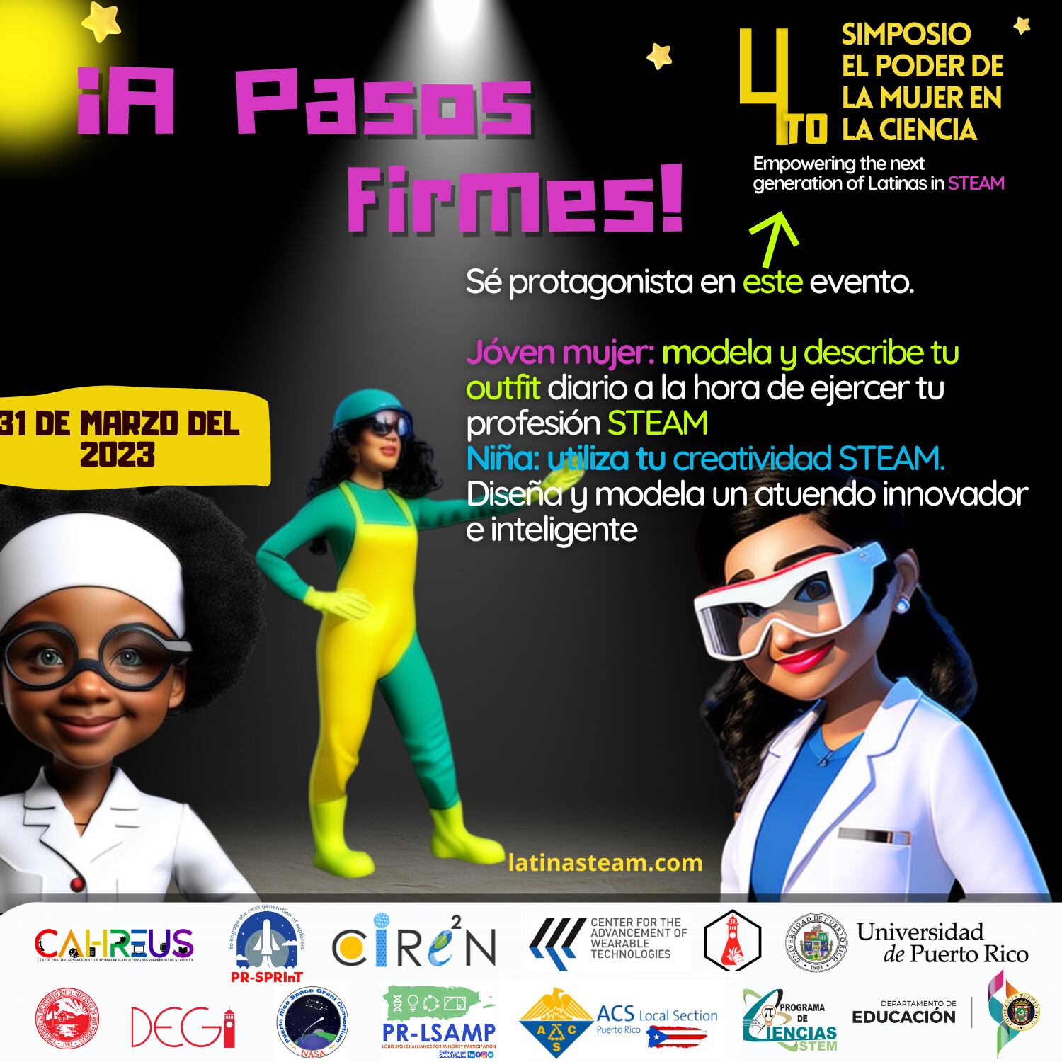 El Simposio El Poder de la Mujer en la Ciencia ha organizado dos eventos importantes. El primero, un desfile de modas llamado A pasos firmes. La invitación es para las jóvenes científicas que les guste el modelaje y enseñar sobre la vestimenta, protección y utilidad cuando entran en las profesiones STEAM. Las niñas creativas también pueden participar diseñando y modelando un traje inteligente. Se reconocerán las mejores creaciones. Las interesadas deben completar el formulario antes del 15 de marzo: