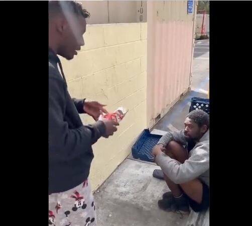 “Los Ángeles, California, tiene la tercera población sin hogar más grande de los Estados Unidos. Y hoy, es mi trabajo asegurarme de que haya una persona menos hambrienta en las calles”, inicia Tre en el clip, quien tras una breve conversación con el sujeto entra al restaurante y se tarda unos minutos.