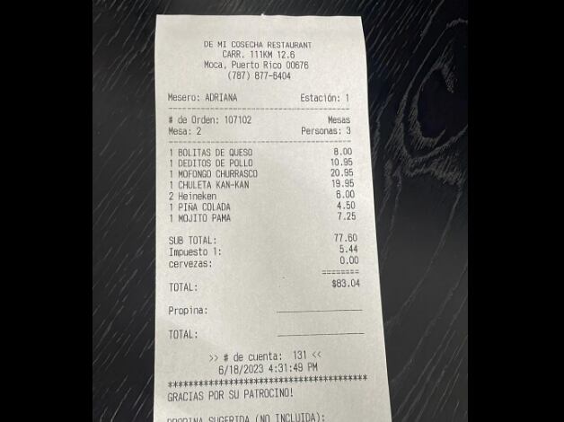 El recibo también indica que los clientes acudieron a eso de las 4:00 de la tarde del domingo, día de los padres al establecimiento del área oeste de la isla.