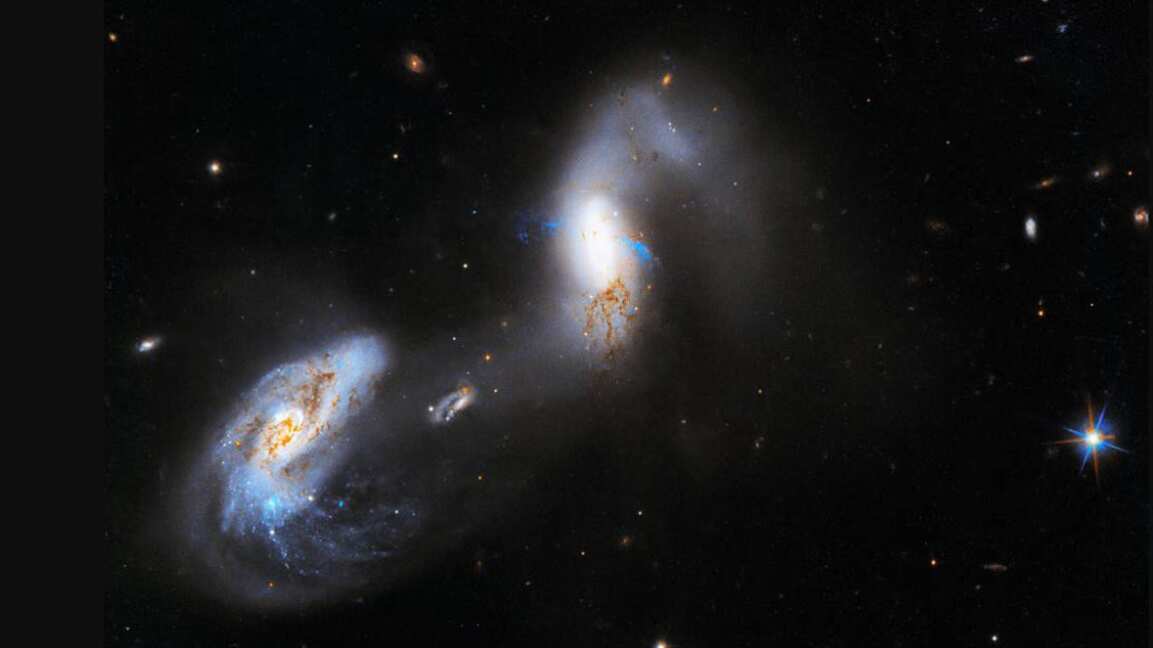 La descripción de la imagen que publicó la agencia espaciales dice lo siguiente: “Una galaxia brillante, blanca y difusa brilla cerca de la esquina inferior izquierda con franjas rojizas de polvo debajo de su centro. Una galaxia espiral más pequeña brilla justo encima de ella, contra un fondo negro del espacio”.