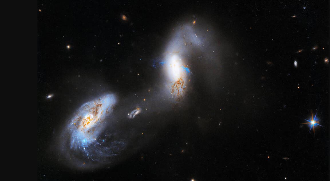 La descripción de la imagen que publicó la agencia espaciales dice lo siguiente: “Una galaxia brillante, blanca y difusa brilla cerca de la esquina inferior izquierda con franjas rojizas de polvo debajo de su centro. Una galaxia espiral más pequeña brilla justo encima de ella, contra un fondo negro del espacio”.