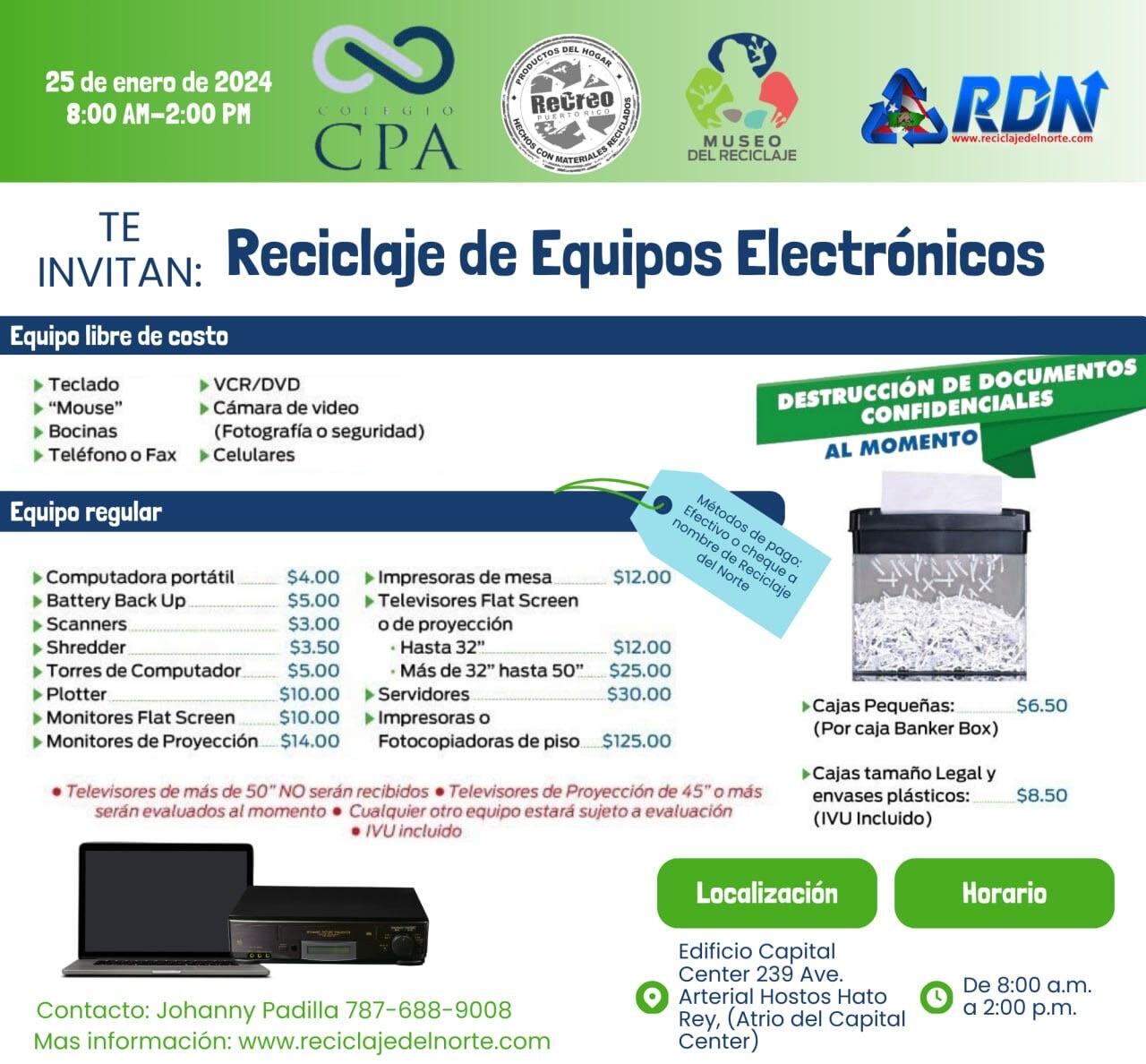 El Colegio de Contadores Públicos Autorizados de Puerto Rico (CCPA) celebrará el próximo jueves, 25 de enero de 2024 un evento de reciclaje de equipos electrónicos y de destrucción de documentos confidenciales para sus colegiados y la comunidad en general, anunció su presidenta, la CPA Edmy Rivera.