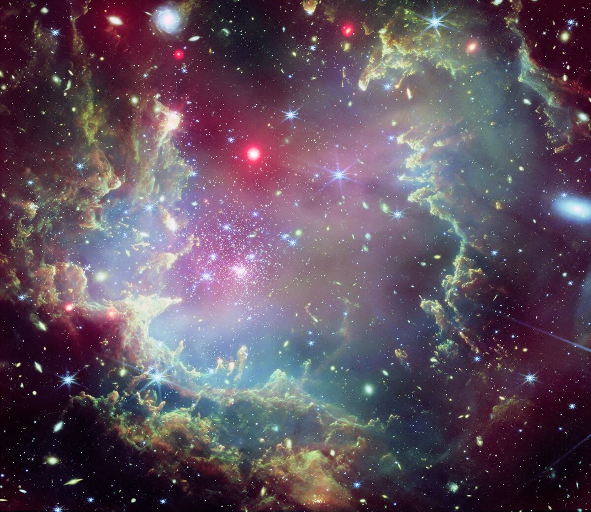 NGC 602 es un cúmulo estelar que se encuentra en las afueras de la Pequeña Nube de Magallanes, una de las galaxias más cercanas a la Vía Láctea. Esta imagen combina rayos X del Observatorio de rayos X Chandra de la NASA y datos infrarrojos del Telescopio Espacial James Webb de la NASA.