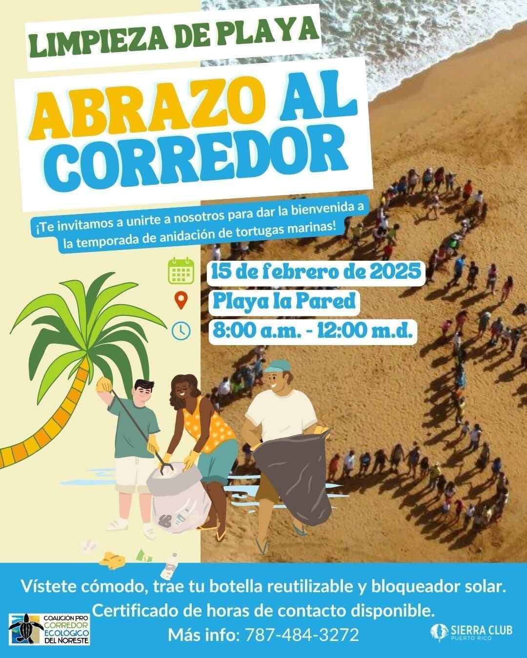 El “Abrazo al Corredor” es una actividad anual organizada por la coalición Pro Corredor Ecológico del Noreste (CPCEN) para dar la bienvenida a la temporada de anidaje de los tinglares. Como parte del evento, se llevará a cabo un recogido de desperdicios en el área de La Pared, acompañado de sesiones educativas sobre el trabajo de los tortugueros y la importancia de la conservación de las tortugas marinas.