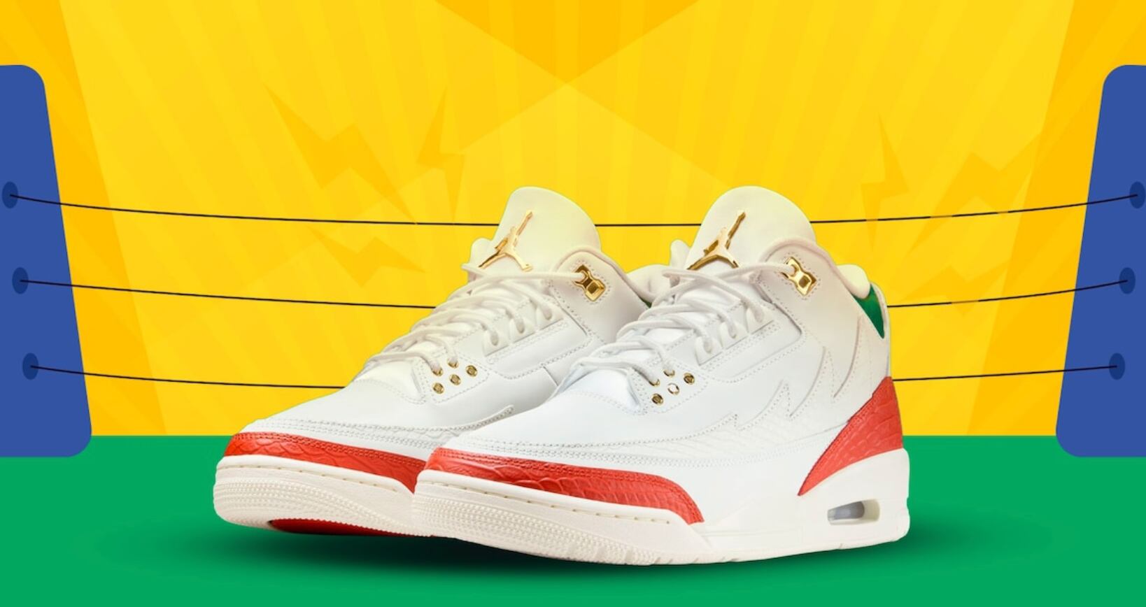 Las Jordan 3 Retro “El Vuelo” son un modelo cargado de identidad cultural. El diseño, con una base en color blanco, incorpora detalles en verde, rojo y dorado en la puntera y el talón. La silueta mantiene las proporciones clásicas de las Air Jordan 3, pero se adorna con texturas que evocan a las máscaras de luchadores y detalles que simulan plumas. La marca explica que el modelo “toma una silueta clásica y la transforma en un símbolo de fuerza, identidad y herencia”.