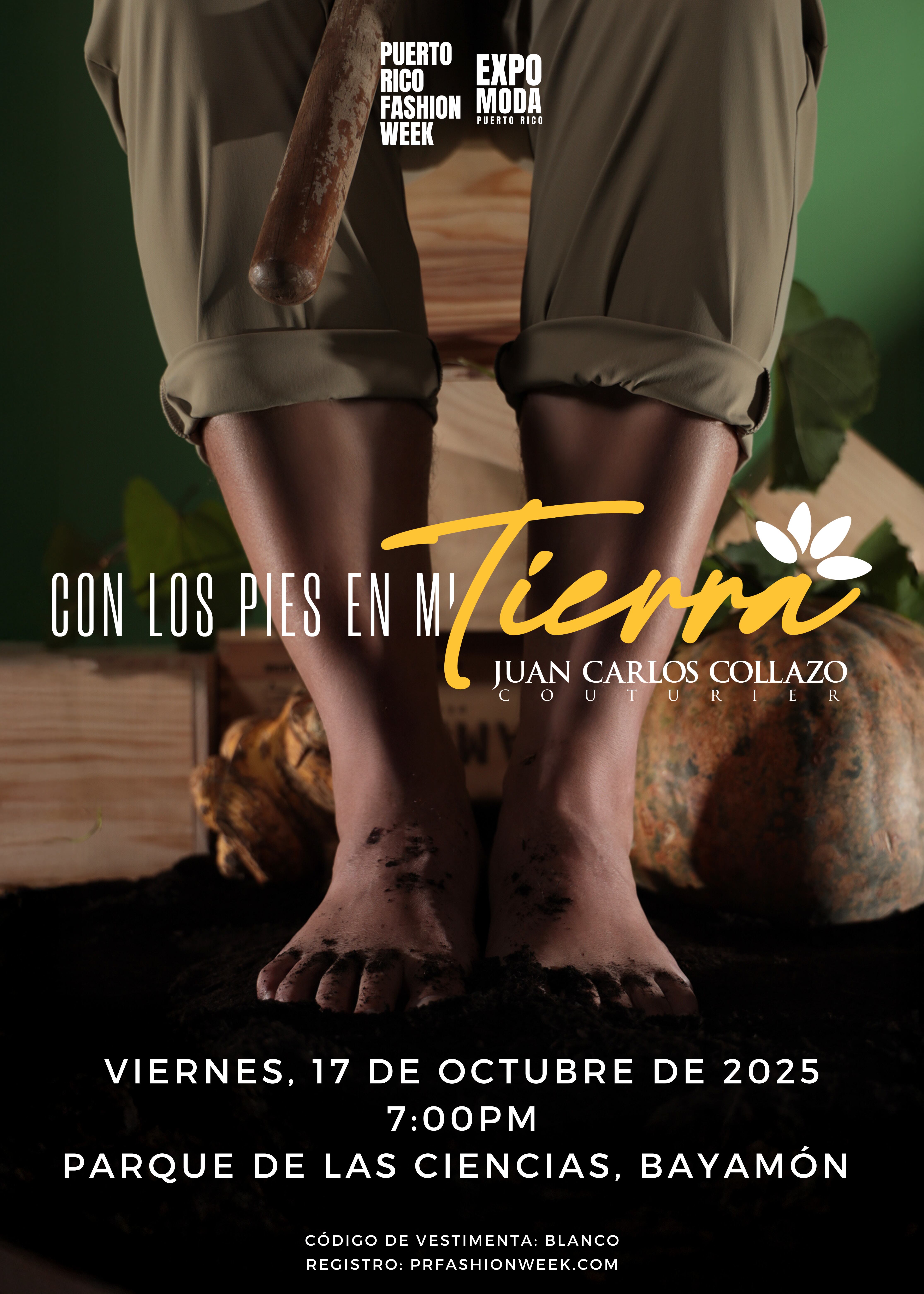 La conexión con la tierra, la memoria y sus raíces puertorriqueñas son parte de la inspiración de la nueva colección del diseñador Juan Carlos Collazo, titulada Con los Pies en Mi Tierra, que se presentará este viernes, 17 de octubre de 2025, a las 7:00 de la noche, en el Parque de las Ciencias de Bayamón.