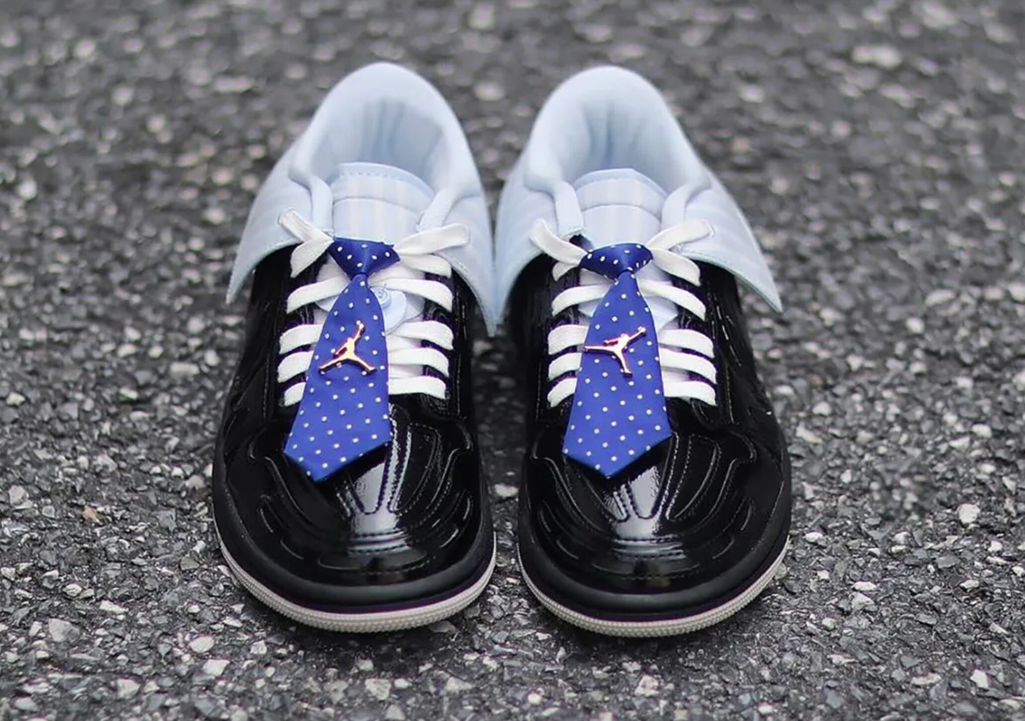El diseño es un ejercicio de narrativa visual: la base de textil con rayas diplomáticas (pinstripe) en negro establece el tono serio, mientras que las capas de charol brillante (patent leather) aportan ese acabado de zapato de vestir “Oxford”. Pero el verdadero “knockout” está en los detalles de diseño: el cuello del tobillo ha sido reemplazado por un cuello de camisa azul con botones, y los cordones incluyen un dije en forma de corbata de lunares con un clip de corbata dorado del Jumpman. Es, literalmente, un traje completo comprimido en una zapatilla.