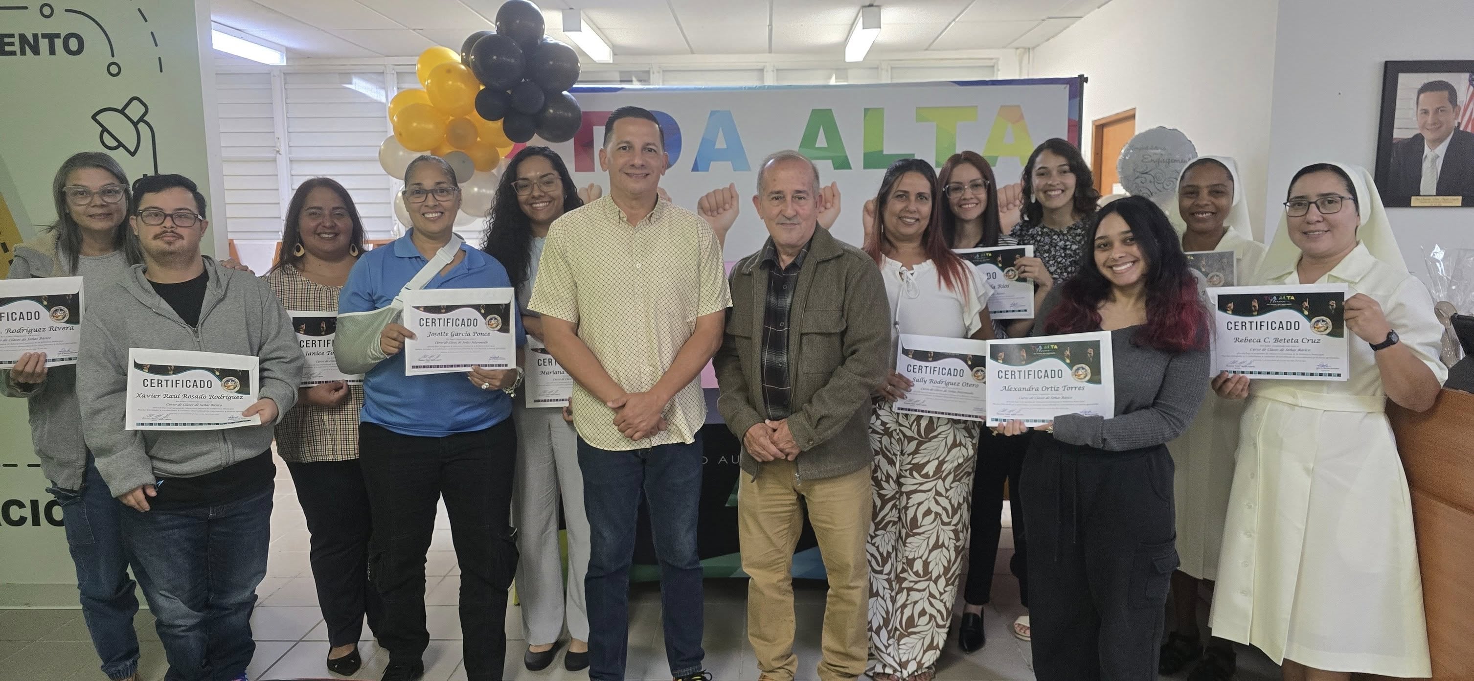 Durante la ceremonia, cerca de 30 participantes completaron los niveles básico e intermedio del programa, una propuesta educativa que por más de dos años ha beneficiado a residentes de Toa Alta y de otros pueblos de la isla interesados en aprender herramientas esenciales de comunicación accesible.