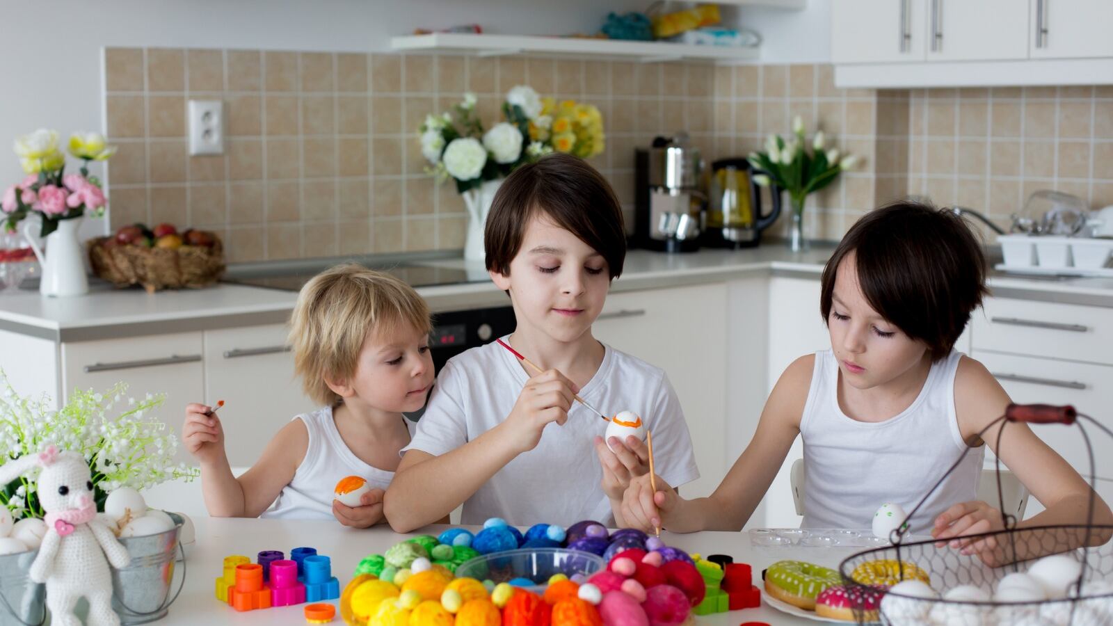 Decorar los huevos de una forma diferente: Motivarlos a echar pintura de un solo color o varios colores en bolsas o contenedor de Ziploc. Luego, con cuidado, los ayudamos a colocar el huevo dentro de la bolsa con la pintura. Cierra la bolsa y gira el huevo suavemente dentro de la bolsa para que la pintura se adhiera al huevo. Después sacamos el huevo de la bolsa y dejamos reposar hasta que la pintura seque. Una vez se complete la primera parte, pueden terminar de decorar el huevo con cintas, stickers o marcadores de colores.