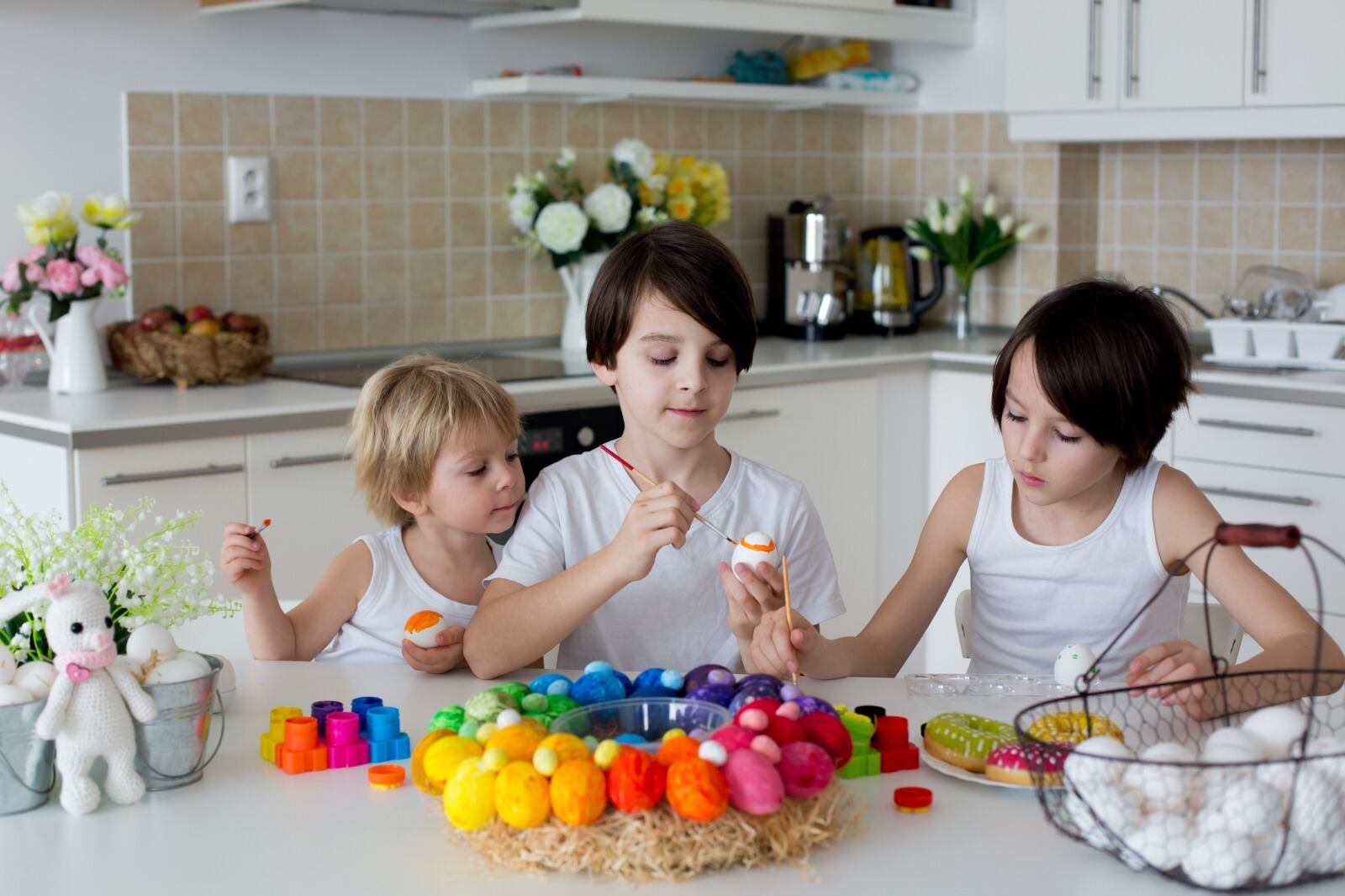 Decorar los huevos de una forma diferente: Motivarlos a echar pintura de un solo color o varios colores en bolsas o contenedor de Ziploc. Luego, con cuidado, los ayudamos a colocar el huevo dentro de la bolsa con la pintura. Cierra la bolsa y gira el huevo suavemente dentro de la bolsa para que la pintura se adhiera al huevo. Después sacamos el huevo de la bolsa y dejamos reposar hasta que la pintura seque. Una vez se complete la primera parte, pueden terminar de decorar el huevo con cintas, stickers o marcadores de colores.