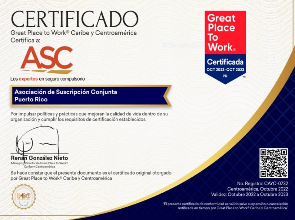 San Juan, PR – ASC, los expertos en seguro compulsorio, está de celebración al haber obtenido el reconocimiento de “GREAT PLACE TO WORK® Caribe y Centroamérica 2022-2023″, una de las certificaciones más prestigiosas a nivel global que otorga anualmente el Great Place To Work Institute a los mejores patronos del mundo. Este prestigioso galardón se basa en los resultados de encuestas anónimas realizadas a los empleados para medir su índice de confianza con el patrono (Trust Index), y una auditoría de la cultura organizacional (Culture Audit) que evalúa las prácticas de Recursos Humanos, así como el sentir de los empleados con su área de trabajo y supervisor directo.