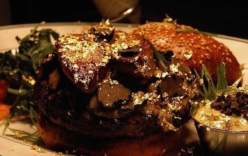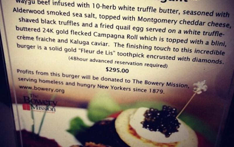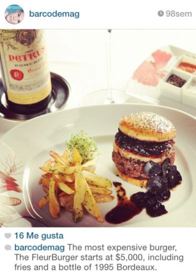 Hamburguesa “Tri-Beef Burger” ($125 dólares): Se vende en el restaurante Old Homestead Steakhouse, Boca Ratón. cuenta con tres tipos de carne de res: American Prime, Wagyu Japonesa y carne argentina. Se sirve con un aderezo hecho a base de chipotle, “The Burger” ($200 dólares): Se encuentra a la venta en Burger King. La nueva hamburguesa se compone de ingredientes selectos: Ternera Wagyu a la parrilla, trufas blancas, cebolla cristal, jamón pata negra con salsa de vinagre balsámico de Módena, “Le Burguer Extravagant” ($295 dólares): La ofrece el restaurante Serendipity 3, situado en el lujoso barrio del Upper East Side de Manhattan, en Nueva York. Se prepara con mantequilla de trufa blanca y polvo de oro de 24 quilates. La carne es import La “Absolutamente ridícula” ($499 dolares): Le pusieron ese nombre por su tamaño enorme. Es la especialidad del restaurante Mallie’s Sports Bar & Grill en Southgate, Michigan. Tiene un peso de 84 kilogramos y los ingredientes son los de una hambur Hamburguesa Douche ($666 dólares): Se vende en el Food Truck 666 Burger, en Nueva York. Su carne Kobe está mezclada con foie gras y se acompaña con queso gruyere fundido al vapor de champagne, langosta, trufas, caviar, unas finas láminas de oro y una “La hamburguesa 777” ($777 dólares): La podemos comprar en el restaurante Le Burger Brasserie, en el hotel Paris en Las Vegas. Hecha de carne Kobe, langosta fresca de Maine, cebollas caramelizadas, queso Brie importado, jamón serrano crujiente y ace “Fleur Burger” ($5 mil dólares): Se vende en el restaurante Fleur de Lys en el hotel Mandalay Bay en Las Vegas, Nevada. Está hecha de ingredientes de primera calidad, el precio incluye una botella de champagne Château Pétrus 1990. Está preparada