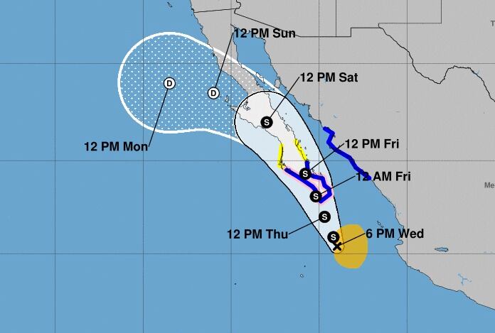 Lidia tenía vientos sostenidos máximos de 75 kilómetros (45 millas) por hora el jueves por la mañana. Su centro estaba unos 185 km (115 millas) al sur-sureste de Cabo San Lucas, México, y avanzaba hacia el norte-noroeste a 13 kph (8 mph).