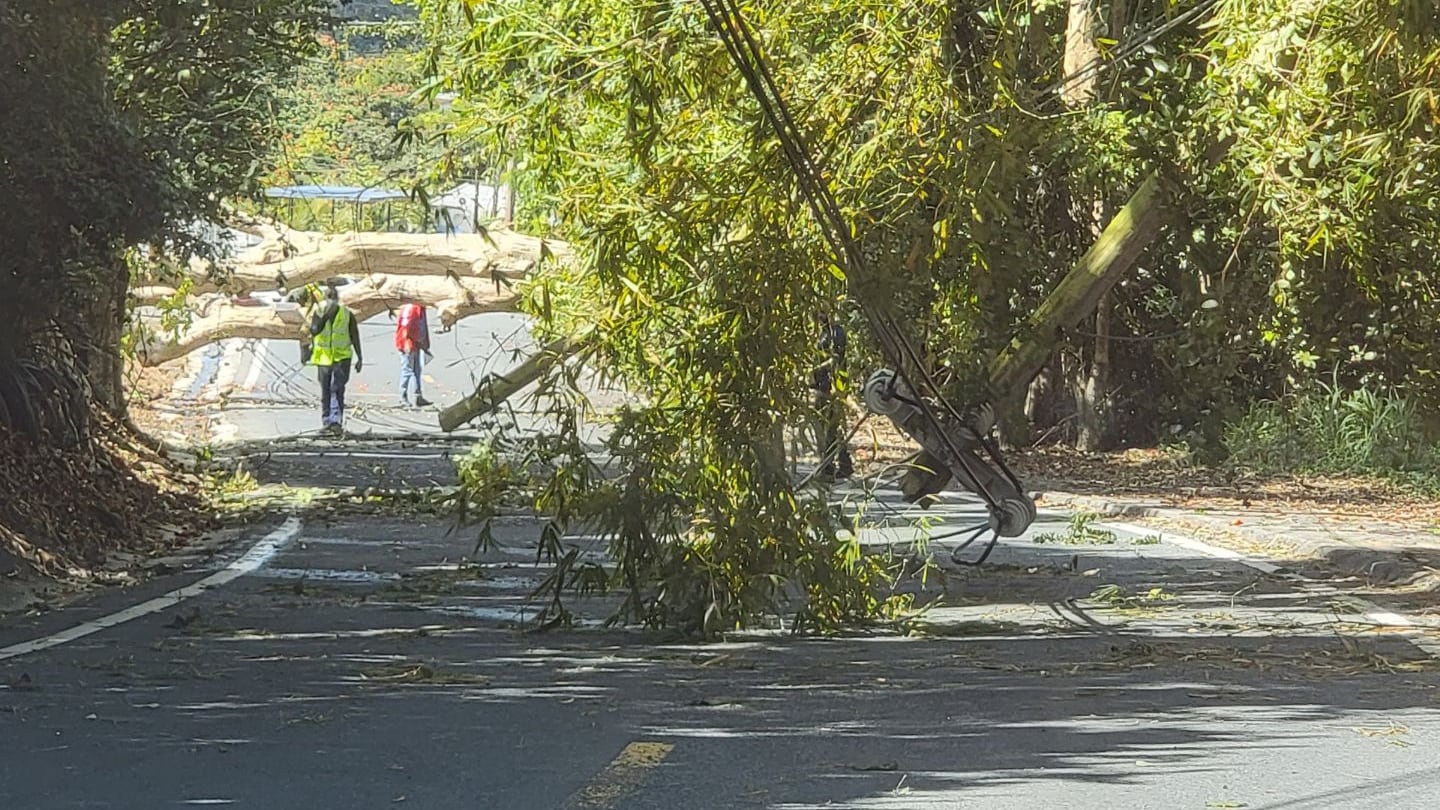 Policías Municipales de Trujillo Alto, investigan el jueves una situación en la carretera 852, después del sector Reparto Xiomara del barrio Quebrada Grande, en Trujillo Alto, donde un árbol cae sobre la vía de rodaje y ocasiona daños a cuatro postes poste del tendido eléctrico.