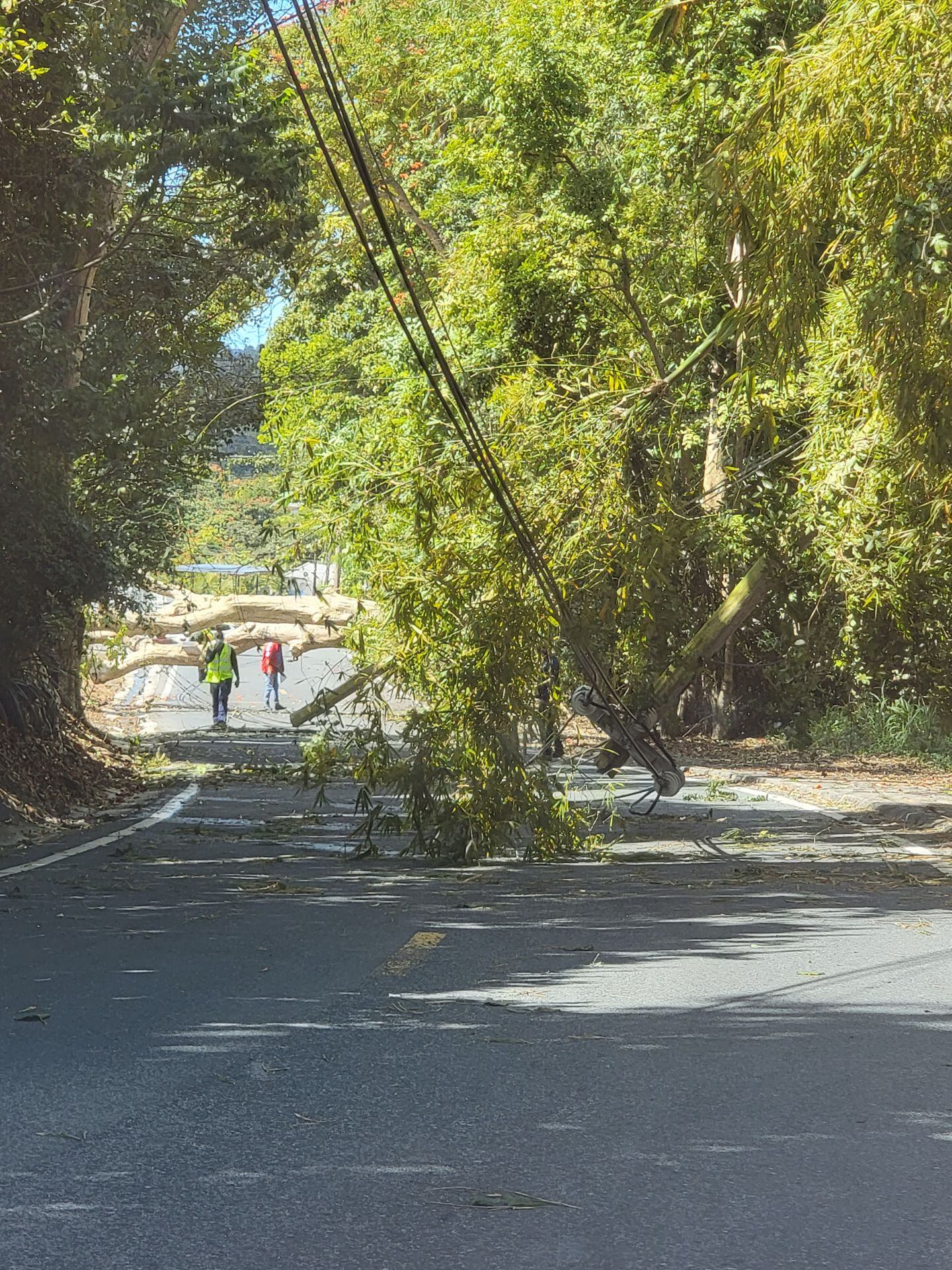 Policías Municipales de Trujillo Alto, investigan el jueves una situación en la carretera 852, después del sector Reparto Xiomara del barrio Quebrada Grande, en Trujillo Alto, donde un árbol cae sobre la vía de rodaje y ocasiona daños a cuatro postes poste del tendido eléctrico.