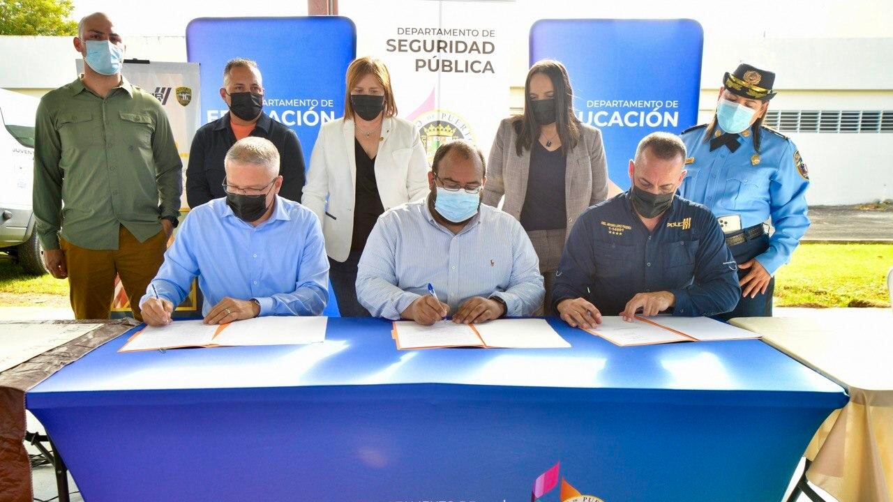 El secretario del Departamento de Educación (DE), Eliezer Ramos Parés, junto al secretario del Departamento de Seguridad Pública (DSP), Alexis Torres Ríos y el comisionado del Negociado de la Policía, Antonio López Figueroa, formalizaron un acuerdo para llevar charlas, talleres y actividades a los planteles escolares para la prevención de conductas de alto riesgo.