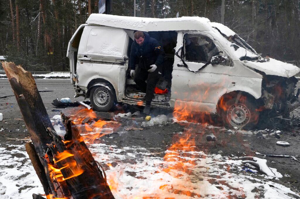 El violento ataque se produjo poco después que los rusos atacaron el centro de Járkiv, la segunda ciudad más grande de Ucrania, causando fuertes daños en un edificio municipal emblemático de la era soviética. Una filmación de circuito cerrado mostró una bola de fuego frente al edificio y unos pocos autos que salían de entre el humo.