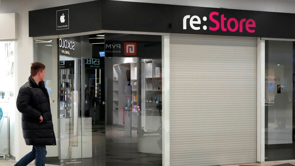 Un hombre pasa frente a un 're:Store', una tienda de reventa de productos de Apple en San Petersburgo cerrada, 2 de marzo de 2022. (Dmitri Lovetsky/AP)