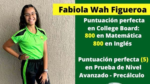 La joven Fabiola Wah Figueroa obtuvo puntuaciones perfectas en las pruebas avanzadas del College Board para Inglés y Matemáticas, además de pasar también con puntuación perfecta la prueba de nivel avanzado de Pre-Cálculo.