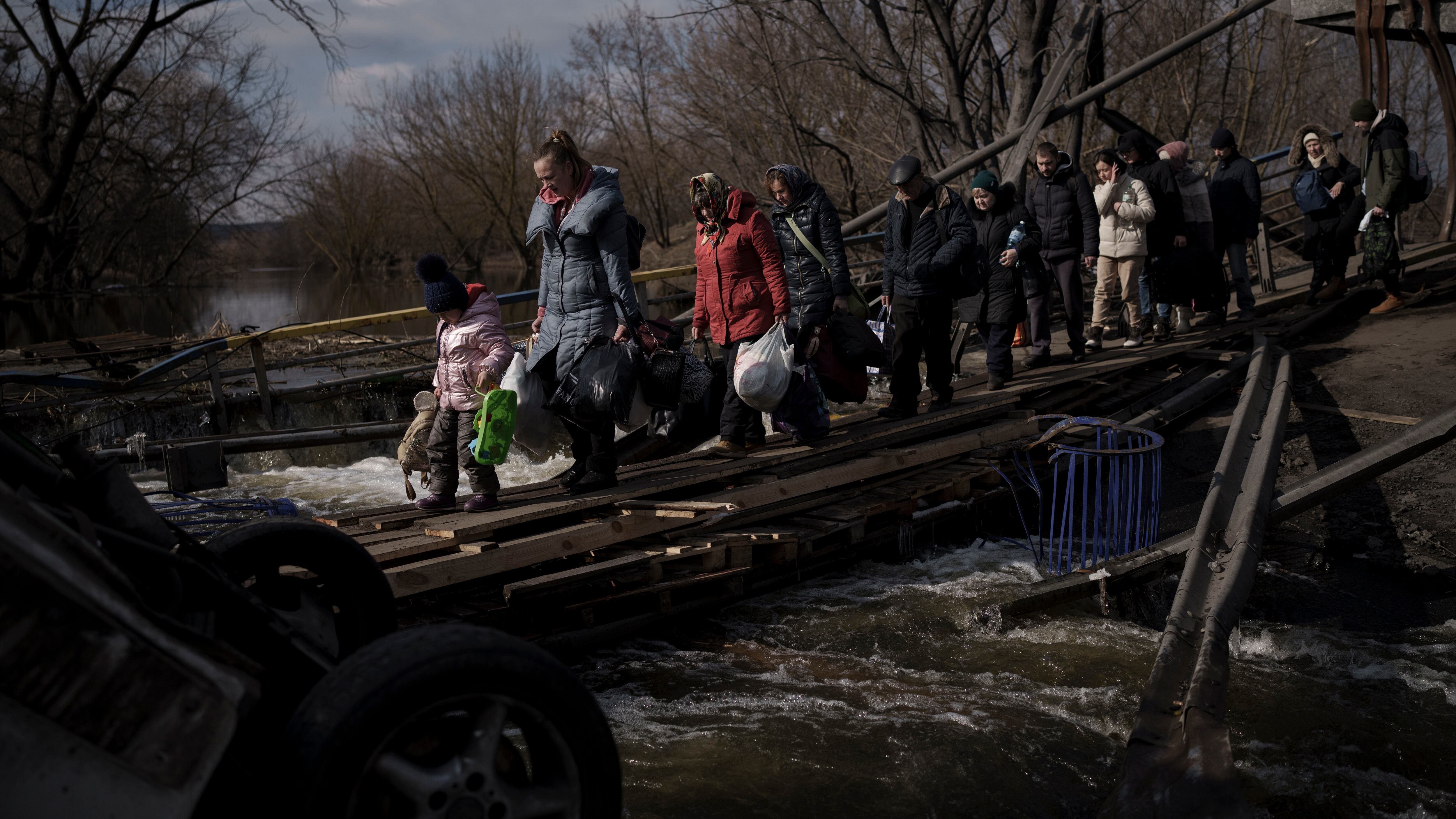 Mientras, los civiles que trataban de escapar del suburbio capitalino de Irpin se vieron forzados a caminar sobre tablones resbalosos de un puente improvisado, porque las tropas ucranianas volaron el puente de concreto a Kiev hace unos días para retrasar el avance ruso.