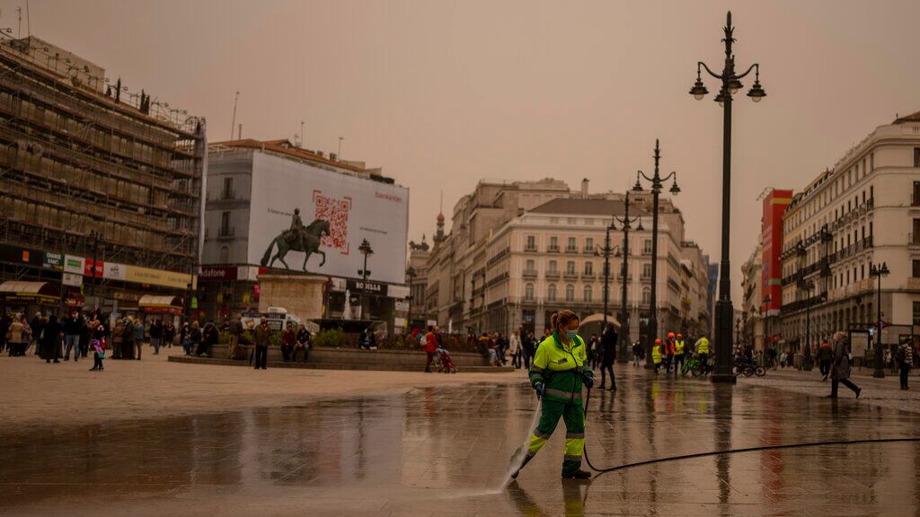 El cielo sobre Madrid conservaba un color gris sucio y la visibilidad estaba reducida en una gran parte del país. Las cuadrillas municipales barrían la arena de las calles. Fotos curiosas del polvo aparecían en las redes sociales, como las imágenes de nueve teñida de rojo en unas montañas cerca de Madrid.