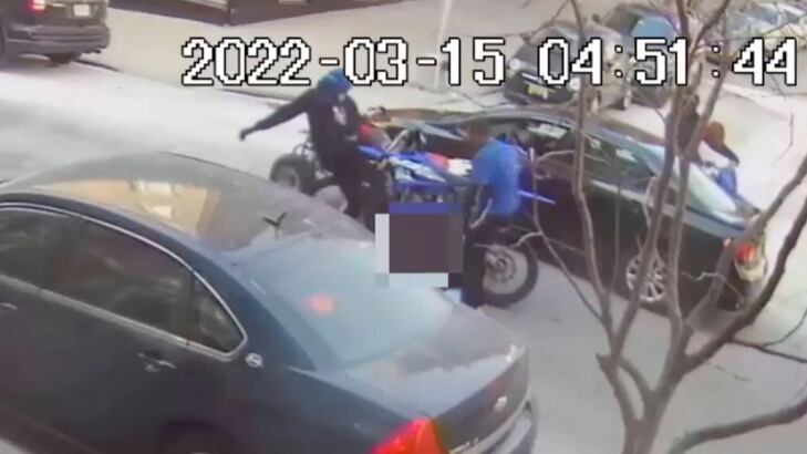 Un grupo que pertenece a una ganga de motocilistas asaltaron a una familia en una calle de Harlem en Nueva York y el momento fue capturado por una cámara de seguridad.