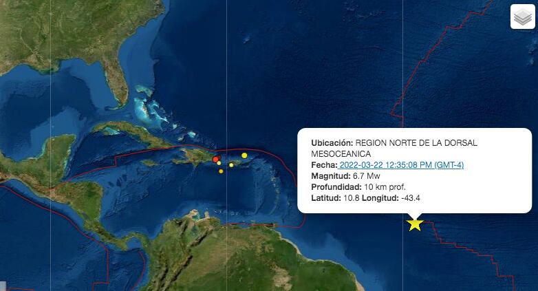La red sísmica indicó que el terremoto ocurrió en la latitud 10.8, longitud -43.4 en la región norte de la Dorsal del Atlántico.